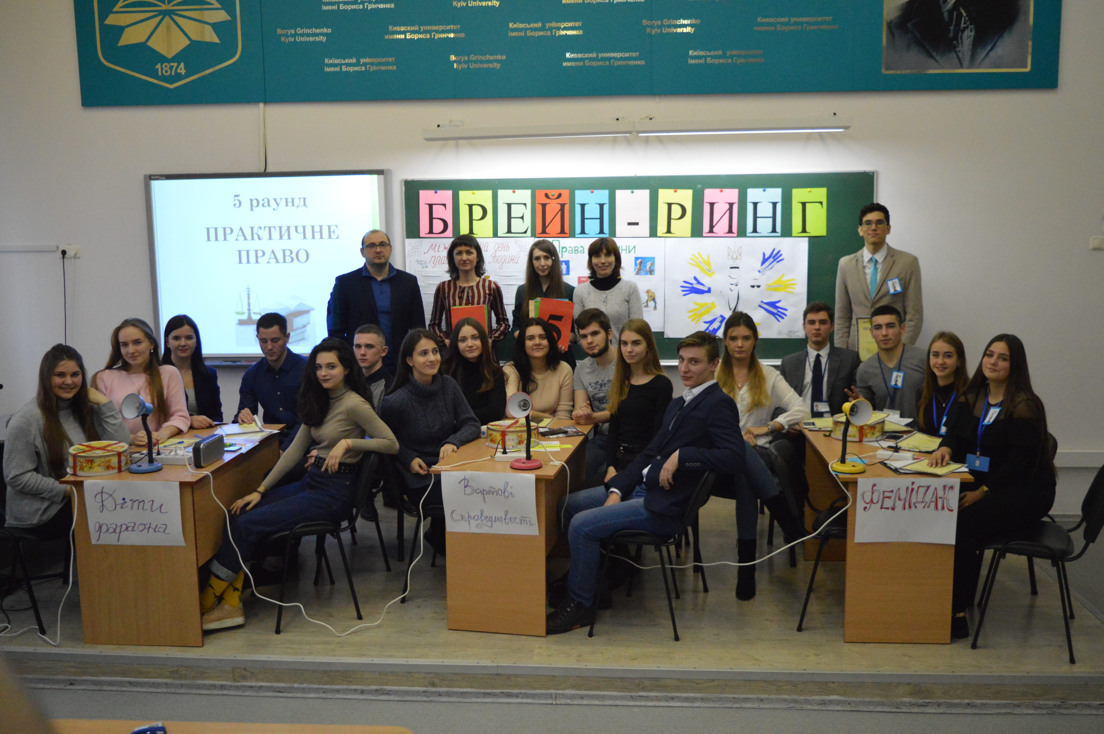 7 грудня 2018 р. в Київському Університеті імені Бориса Грінченка в рамках Грінченківської декади та Тижня права пройшла пізнавально-інтелектуальна гра Брейн-ринг на тему: «Грінченківці знають свої права» між студентами спеціальності «Право» Факультету права та міжнародних відносин і Університетського коледжу. Захід був спрямований на наукове та пізнавальне сприйняття можливостей і обов’язкової міри поведінки студентів-грінченківців у суспільстві та під час навчання.
