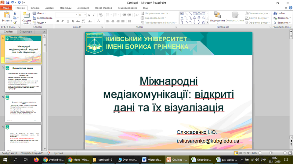 25 листопада 2020 року студенти вказаних освітніх програм галузі Міжнародні відносини разом з доцентами кафедри міжнародних відносин та міжнародного права Тимченко Л.О., Мельник Г.М. та Ілюк Т. В., прослухали семінар, присвячений основам «журналістики даних». Під час семінару учасники з’ясували як за допомогою даних та їх візуалізації можна розповідати актуальні історії, що таке відкриті дані, які вимоги до них існують, як та де їх знайти, опрацювати та візуалізувати за допомогою Flourish. Ініціювала семінар доцент кафедри міжнародних відносин та міжнародного права Слюсаренко Ірина Юріївна, яка провела його в межах проєкту «Використання даних у боротьбі проти маніпуляцій та дезінформації». Цей семінар відбувся в рамках співпраці Інформаційно-аналітичного центру та Наукового товариства студентів, аспірантів докторантів і молодих вчених Факультету права та міжнародних відносин Київського університету імені Бориса Грінченка.