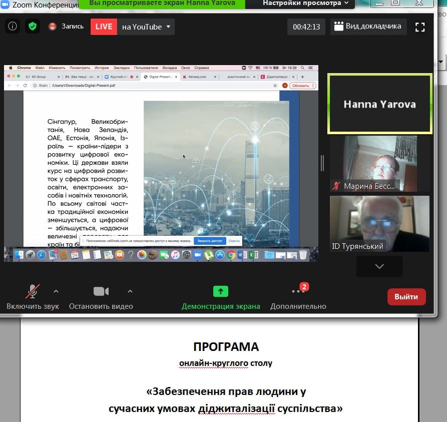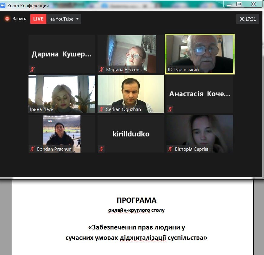 Проблематика круглого столу охопила актуальні питання забезпечення прав людини в умовах діджиталізації суспільства; проблеми пошуку шляхів розв’язання нагальних проблем діджиталізації суспільства; окреслення перспектив розвитку суспільства, права та міжнародних відносин на тлі діджиталізації. Особливу увагу привернув виступ Турянського Ігоря Мефодійовича, першого Надзвичайного та Повноважного Посла України у Туреччині, співзасновника Міжнародного культурного центру «Сяйво», члена Національної спілки журналістів України, члена українського відділення Асоціації міжнародного права, присвячений ситуації з дотриманням прав людини в Україні на прикладі рішень Європейського суду з прав людини (ЄСПЛ). Студенти мали можливість задати питання пану Послу та іншим доповідачам.