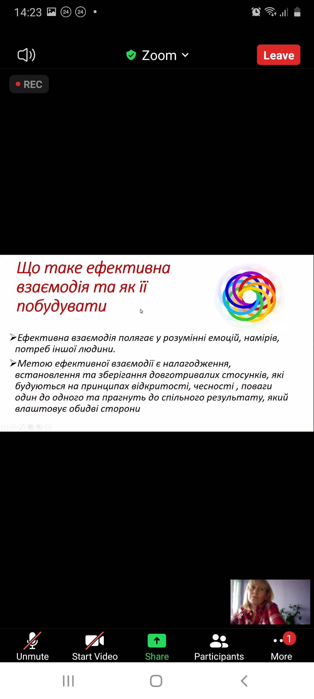 Тренер продемонструвала можливості використання прийомів та технік розвитку ефективної комунікації викладача зі студентом, розкрила зміст поняття ефективної взаємодії з іншими людьми, проаналізувала можливі психологічні бар’єри у спілкуванні та способи їх подолання, розповіла про маніпуляцію як форму неефективної взаємодії, допомогла засвоїти ефективні методи протистояння маніпулятивному впливу, а також показала як застосовувати на практиці техніки, які сприяють досягненню ефективності у спілкуванні.