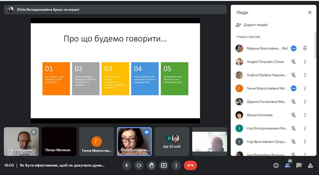 У вебінарі взяли участь викладачі всіх трьох кафедр Факультету: міжнародних відносин та міжнародного права, публічного та приватного права, іноземних мов. Під керівництвом Юлії Володимирівни наші викладачі поспілкувалися про види стресу, їх вплив та накопичувальний ефект у нашому житті; намагалися зрозуміти, що заважає, а що надихає на нові досягнення; розглянули типові проблеми управління часом та способи, як їх вирішити; опанували найбільш дієвими техніками саморегуляції та способами «підзарядки батарейок». Наприкінці зустрічі учасники вебінару намітили план підтримки та відновлення власної працездатності; потренувалися у техніках поповнення «енергетичних ресурсів», дуже потрібних наприкінці навчального року.