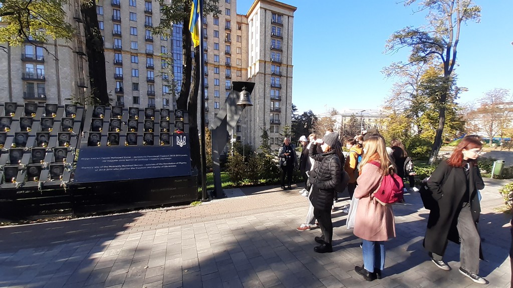 Студенти та викладачі побували безпосередньо у місцях ключових подій: на Майдані Незалежності, алеї Героїв Небесної Сотні, вулиці Інститутський. Крім експозиції, відвідувачів ознайомили з основними напрямами діяльності Інформаційно-виставкового центру Музею Майдану; вимірами міжнародної співпраці; започаткованою традицією вшанування Героїв Небесної Сотні Дзвоном Гідності. 70-кілограмовий дзвін установлено на території майбутнього Меморіалу Героїв Небесної Сотні поруч із каплицею архистратига Михаїла та українських новомучеників. Як і дерев'яні хрест та каплиця на місці розстрілів, дзвін поруч зі стелою з портретами загиблих протестувальників знаменує подвиг героїв і звитягу українського народу. Дзвін Гідності освячено й відкрито 1 грудня 2020 року. Це особливий для української історії день. 1 грудня 1991 року 90% українців на референдумі в тодішній УРСР підтримали Акт проголошення незалежності України. А 2013 року саме 1 грудня, за оцінками істориків і публіцистів, Євромайдан переріс у Революцію Гідності. Цього дня до центру Києва прийшли від 500 тисяч до мільйона осіб – і вони вже вимагали не лише євроінтеграції, а й покарання за побитих і розігнаних уночі мітингарів.