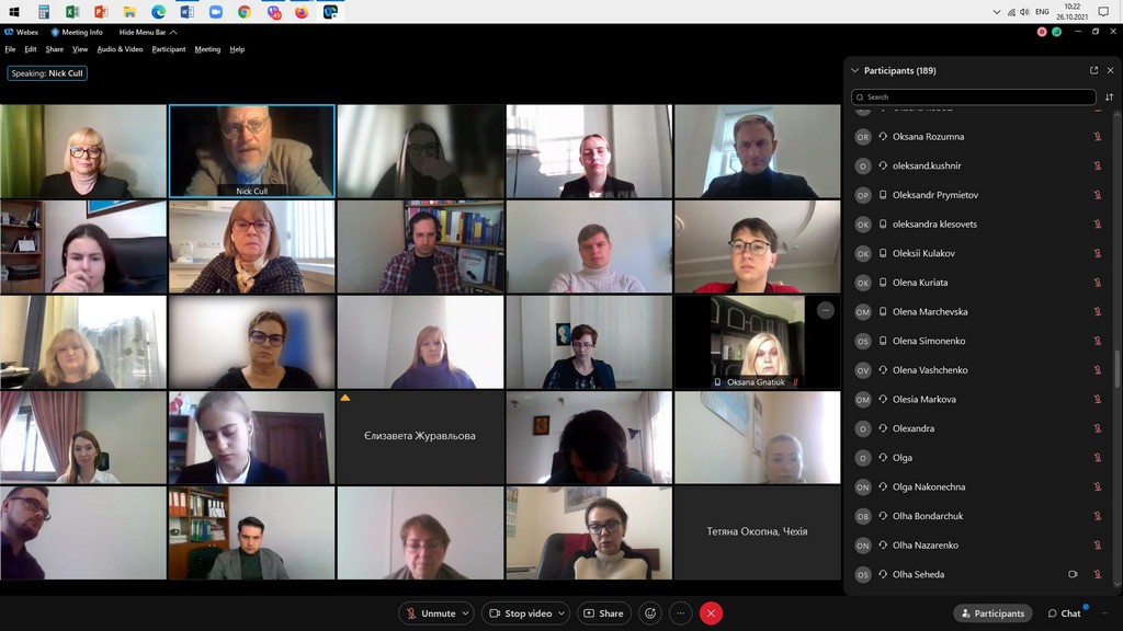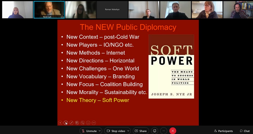 Cтуденти освітніх програм «Суспільні комунікації», «Регіональні студії» та «Міжнародне право» першого (бакалаврського) та «Суспільні комунікації» та «Регіональні студії» другого (магістерського) рівнів, разом з науково-педагогічними працівниками кафедри міжнародних відносин та міжнародного права: доцентками О.А. Брайчевською, Г.М. Мельник, І.Ю. Слюсаренко та старшою викладачкою М.М. Лісовською відвідали онлайн-лекцію «Rethinking public diplomacy» професора публічної дипломатії Ніколаса Дж. Калла. Лекція пройшла у Дипломатичній академії України імені Геннадія Удовенка при Міністерстві закордонних справ України.