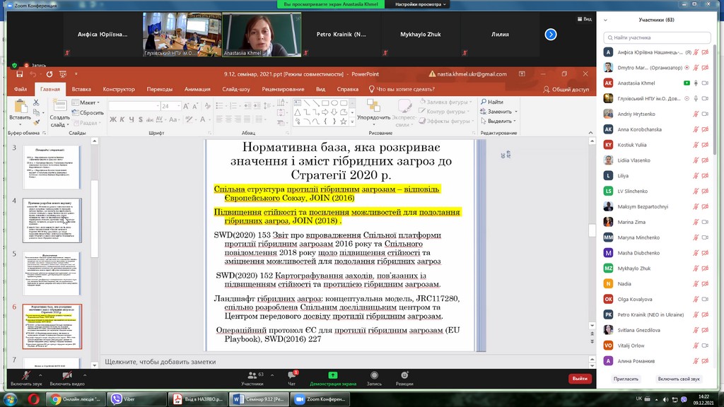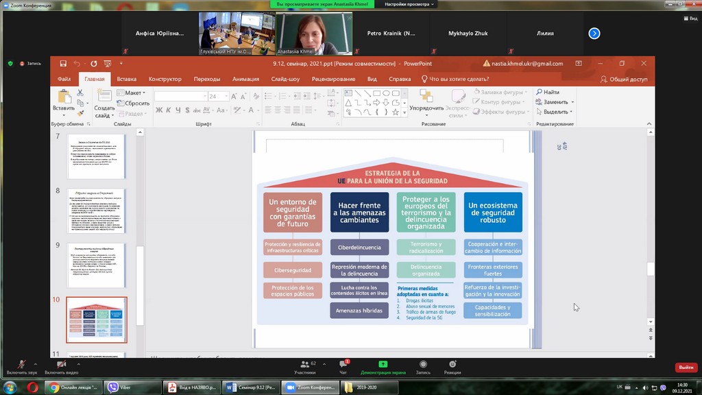 09 грудня 2021 р. професор кафедри публічного та приватного права А.Ю. Нашинець-Наумова взяла участь у Всеукраїнському науково-практичному семінарі «Досвід Європейського Союзу у сфері реагування на виклики безпеки», який проходив у межах реалізації проекту Еразмус+ Модулі Жана Моне «Європейська політична інтеграція: історична ретроспектива та сучасність».