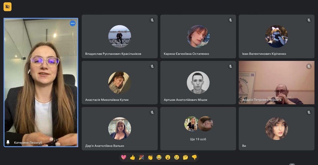 Катерина Лизогуб презентувала майстер-клас на тему: «Особливості здійснення місцевого самоврядування в місті Києві в умовах воєнного стану: Київська міська рада». Студенти мали чудову можливість побачити і послухати відмінницю навчання, екс-юркліністку (2014-2018 рр.) безпосередньо прийняти участь у дискусії. Звертаючись до учасників заходу, Катерина розповіла, що відповідно до Конституції України і Законів України «Про місцеве самоврядування» та «Про місцеві вибори» ( в частині положень які не втратили чинність після прийняття Виборчого кодексу щодо організації та проведення повторних, проміжних, додаткових виборів і заміщення депутатів, обраних у багатомандатному виборчому окрузі, повноваження яких достроково припинені, що діють до наступних чергових або позачергових виборів депутатів місцевих рад) та Виборчого кодексу України – депутатом місцевої ради може стати громадянин України, що досяг повноліття (18 років), якого було обрано на основі загального, рівного, прямого виборчого права шляхом таємного голосування строком на 5 років. Наразі в Київраді працює 120 депутатів, з яких 70 – це коаліція представлена політичними силами від партій ЄС, Удар та Голос. Депутати на місцях представляють інтереси своїх виборців, причому їх кількість коливається від 11 тис. (Голосіївський район) до 29,6 тис. (Соломʼянський район) міста Києва. В середньому навантаження виборців на одного депутата в місті Києві складає 17,6 %.