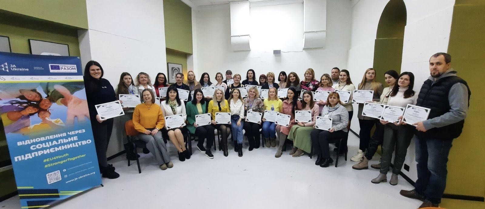 Проєкт Громадської організації «Джуніор Ачівмент Україна» - «Відновлення через соціальне підприємництво» – це практичний курс із соціального підприємництва для студентів 17-24 років, що передбачає створення власного бізнес-проєкту, який вирішує нагальні соціальні, культурні або екологічні проблеми та здійснюється під наставництвом викладачів-кураторів та ментора-підприємця. Проєкт «Відновлення через соціальне підприємництво» включає в себе навчальний курс для викладачів ЗВО та студентів, проведення конкурсу ідей та захист бізнес-проєктів соціального підприємництва між командами ЗВО України, а також запуск стартап-акселератора для команд-переможців.