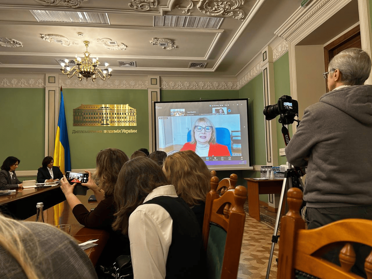 До зустрічі, що проходила у Дипломатичній академії України, долучилися і студентки 2-го курсу Факультету права та міжнародних відносин Київського столичного університету імені Бориса Грінченка Софія Дмитренко, Юлія Демська та Анастасія Зімбіцька під керівництвом доцентки кафедри міжнародних відносин, очільниці Інформаційно-аналітичного центру ФПМВ Тетяни Ілюк. Представниці Університету Грінченка поділилися з присутніми власними напрацюваннями в царині публічної дипломатії, розповіли про роботу щодо формування практичних навиків реалізації проєктів публічної дипломатії на Факультеті права та міжнародних відносин, про наявні проєкти промоції України в студентському середовищі зарубіжних країн та дослідження з публічної дипломатії, які проводяться при Інформаційно-аналітичному центрі ФПМВ.