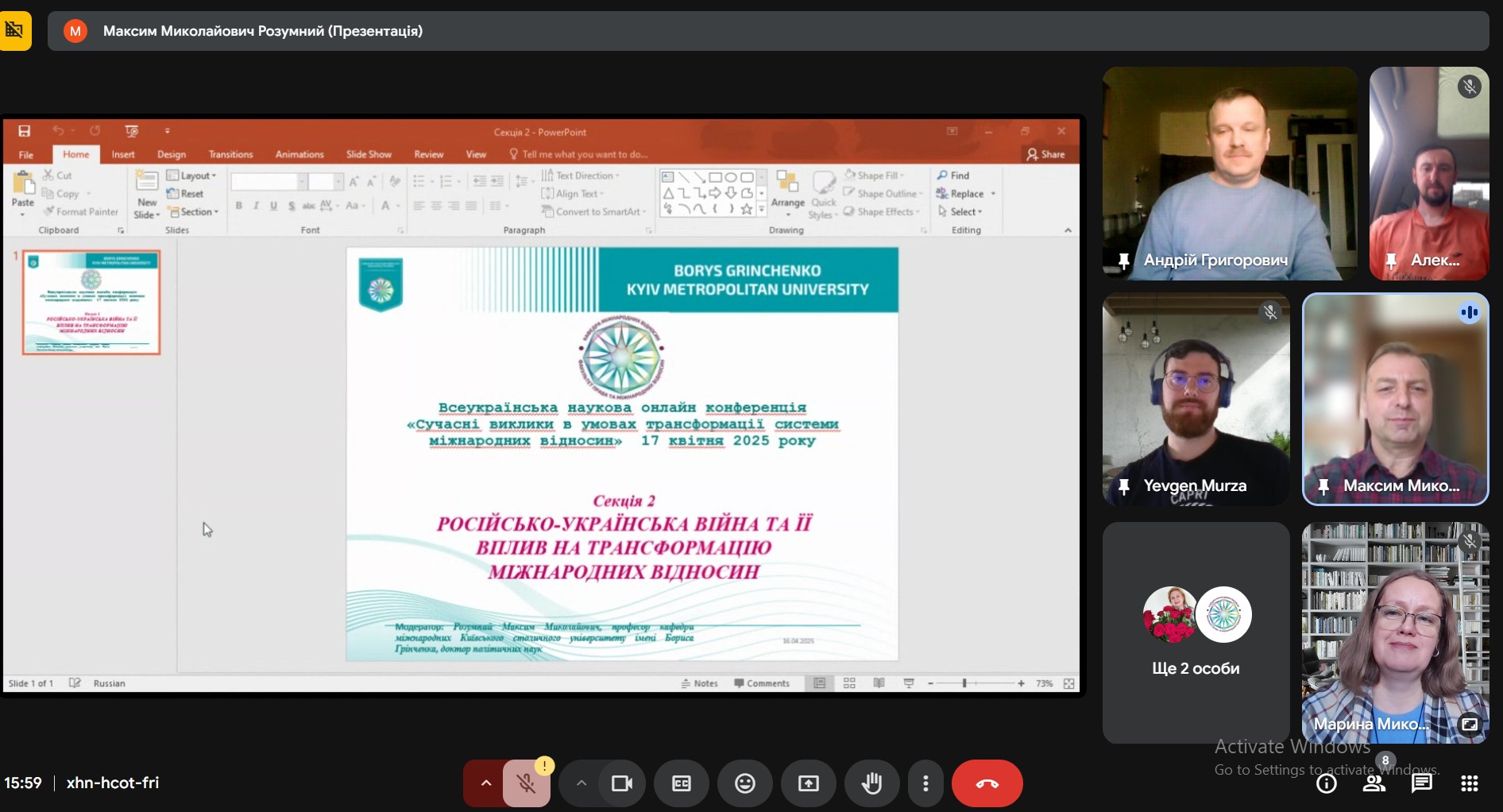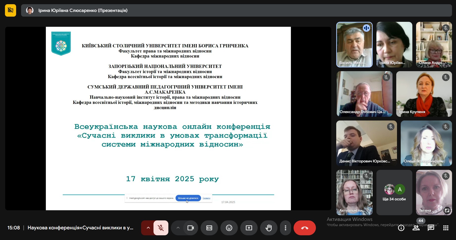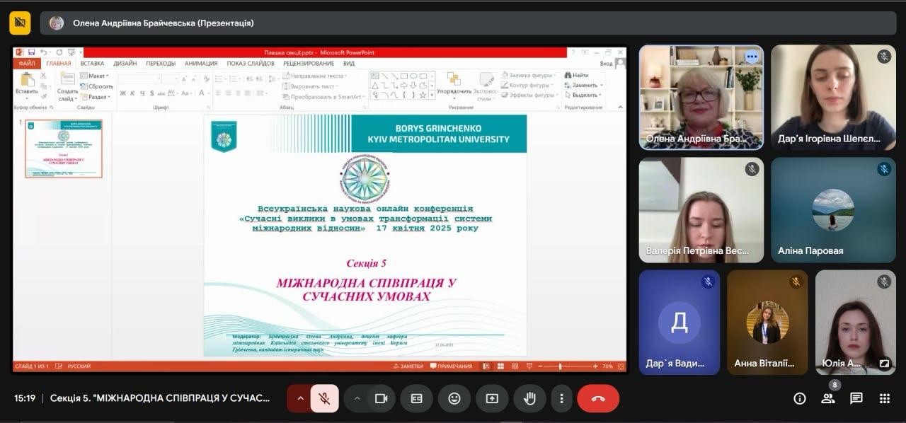 17 квітня 2025 р. на кафедрі міжнародних відносин Факультету права та міжнародних відносин Київського столичного університету імені Бориса Грінченка відбулася Всеукраїнська наукова онлайн конференція «Сучасні виклики в умовах трансформації системи міжнародних відносин». Співорганізаторами конференції виступили профільні кафедри Запорізького національного університету та Сумського державного педагогічного університету імені А.С. Макаренка.