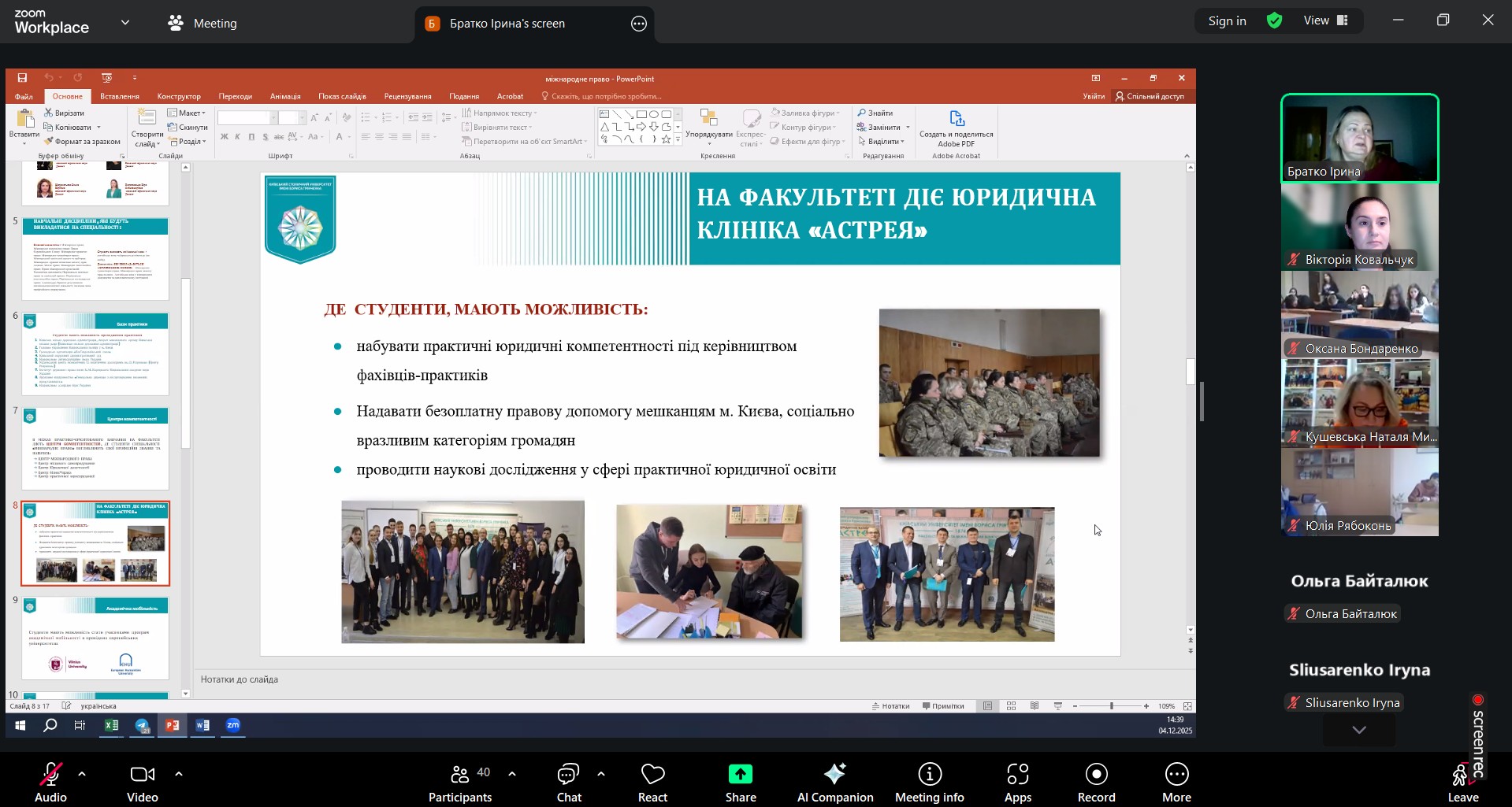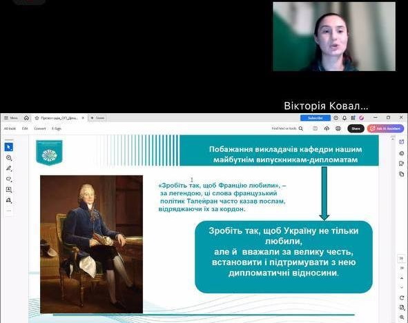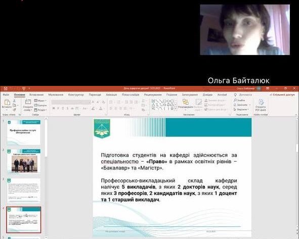 Під час онлайн зустрічі представники всіх кафедр Факультету, а саме: доцентки кафедри міжнародних відносин, гарантки освітніх програм першого (бакалаврського) рівня освіти «Суспільні комунікації» (Слюсаренко І.Ю.) та «Міжнародні відносини та зовнішня політика» (Мельник Г.М.), старша викладачка кафедри, Голова Наукового товариства Факультету Ковальчук В.В., завідувачка кафедри міжнародного права, європейської та євроатлантичної інтеграції, доцентка (Братко І.В), старша викладачка кафедри приватного права (Байталюк О.М.), старша викладачка кафедри іноземних мов (Кушевська Н.М.) розповіли майбутнім абітурієнтам про зміст підготовки за кожною програмою, ключові навчальні дисципліни, основні бази практик, перспективи працевлаштування випускників та діяльність центрів компетентностей, які діють на базі кафедр.