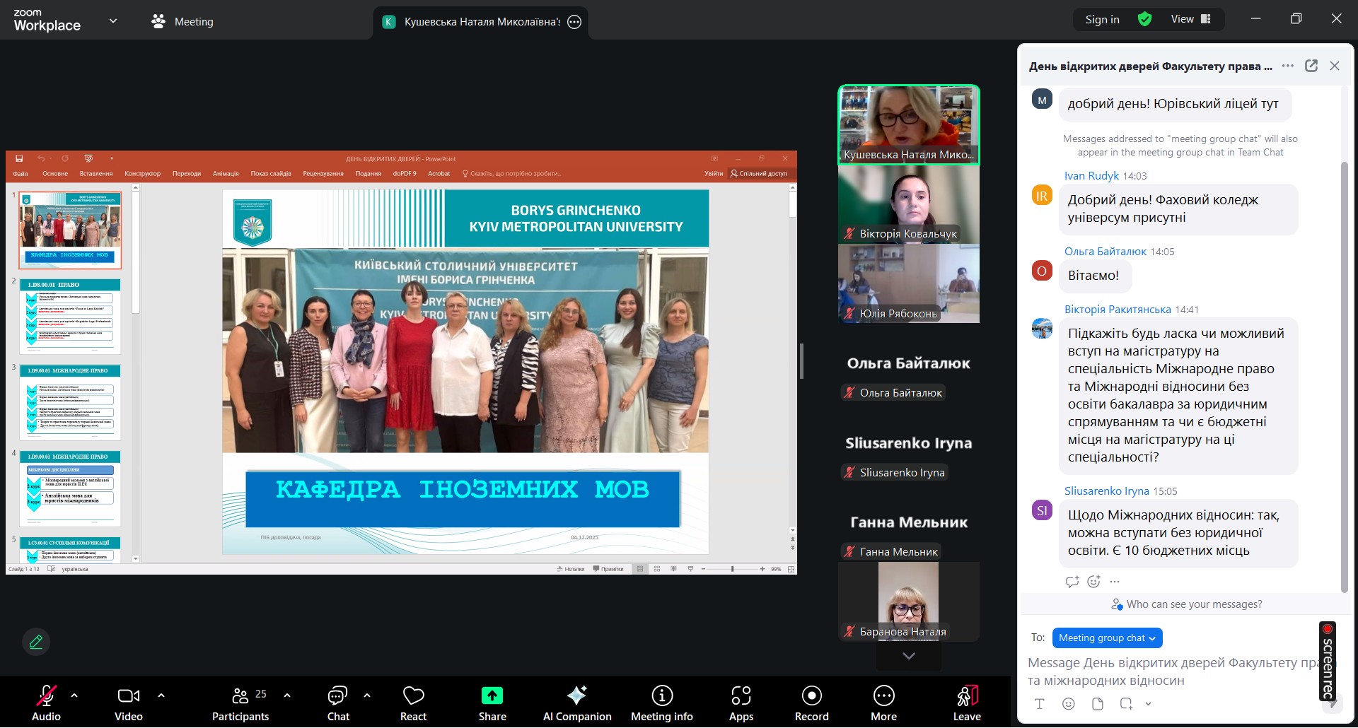 04 грудня 2025 року на Факультеті права та міжнародних відносин відбувся онлайн День відкритих дверей, участь у якому взяли ЗОШ, Ліцеї та фахові Коледжі Києва та України, серед яких відзначимо: Ліцей «Фінансовий» Подільського району м. Києва, Ліцей №49 Шевченківського району м. Києва, Ліцей № 30 «ЕКОНАД» Дніпровського району м. Києва, Ліцей № 80 Печерського району м. Києва, Опорний Заклад Освіти Юрівський ліцей Гатненської сільської ради Фастівського району Київської області, Радомишльський ліцей №3 Житомирської області, фаховий Коледж «Універсум» Київського столичного університету імені Бориса Грінченка