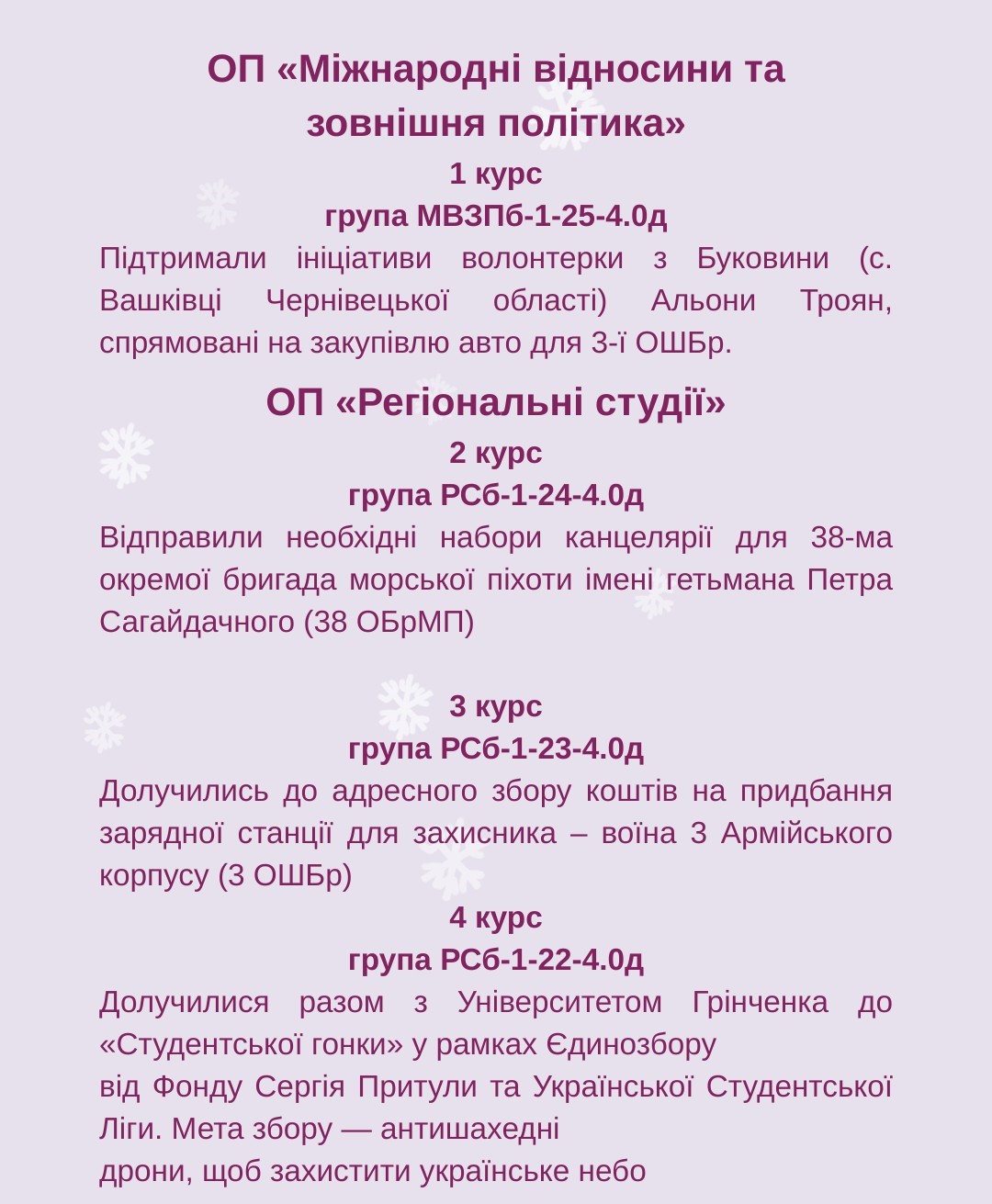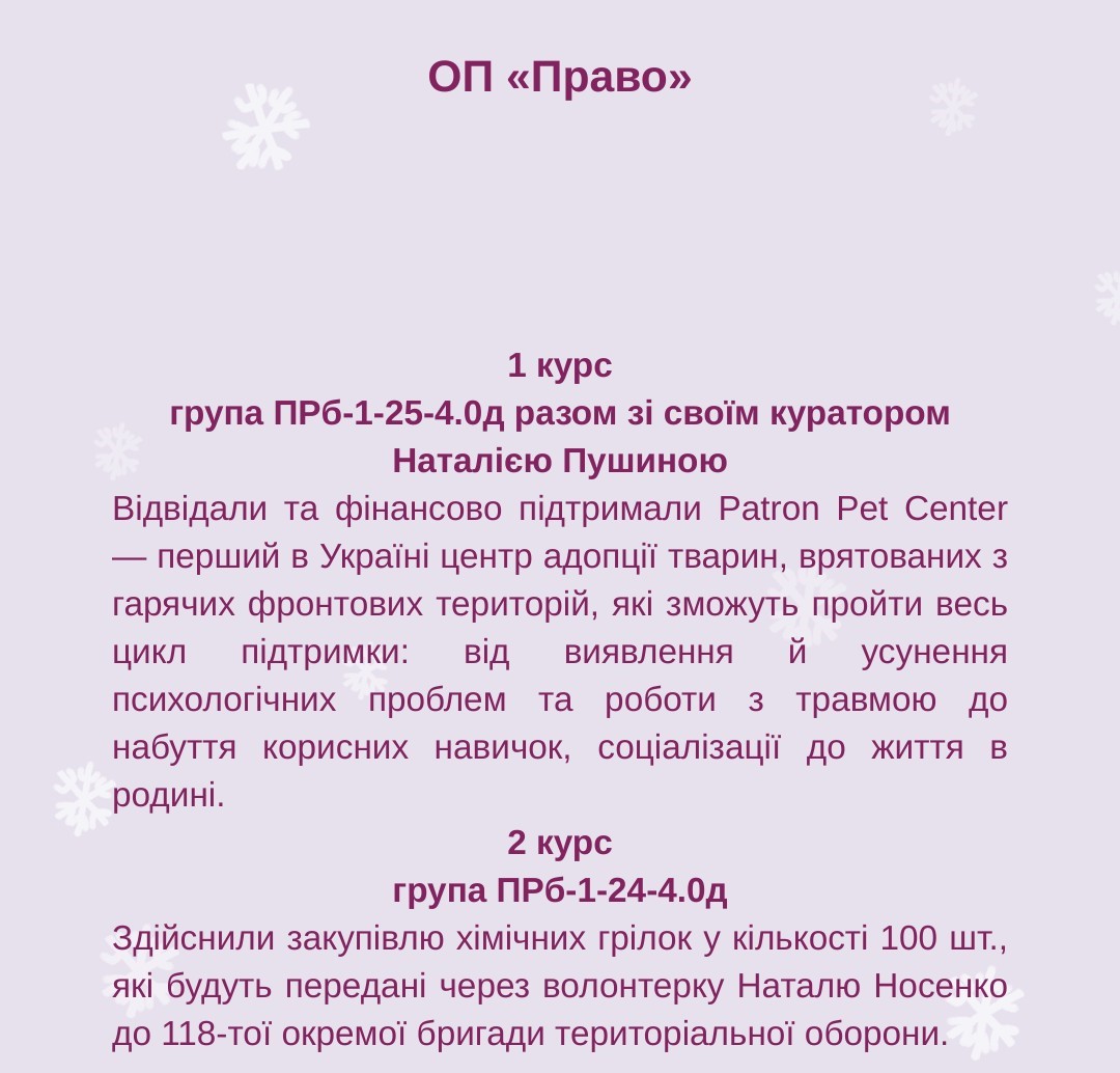 Отже, в межах «Благодійного різдвяного Марафону добрих справ - 2025» кожна академічна група Факультету взяла участь в окремій благодійній ініціативі. Детальніше можете ознйомитись на фото.