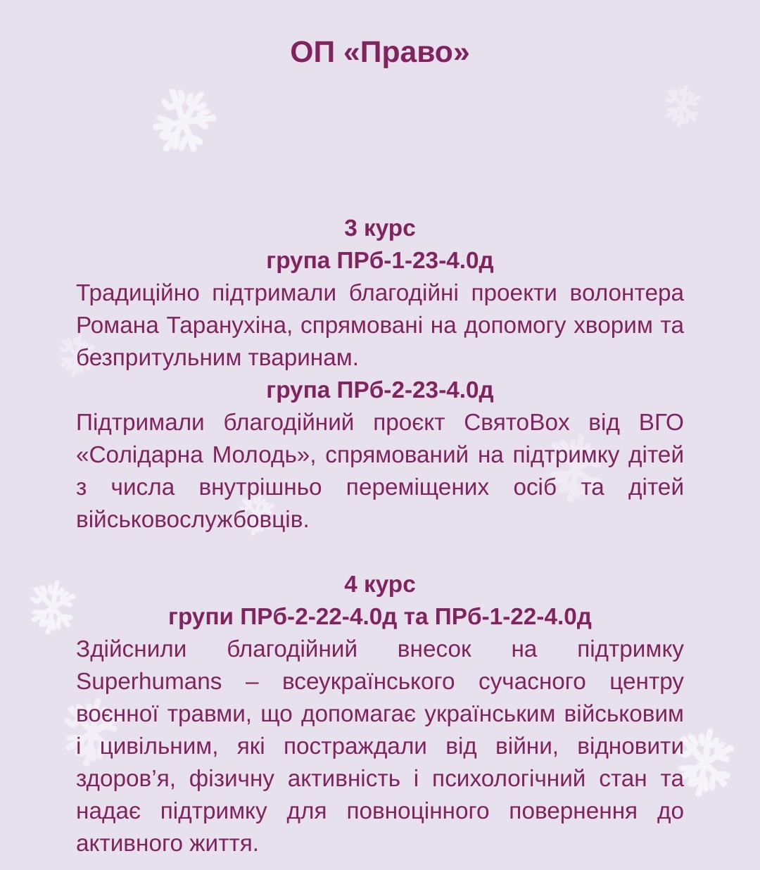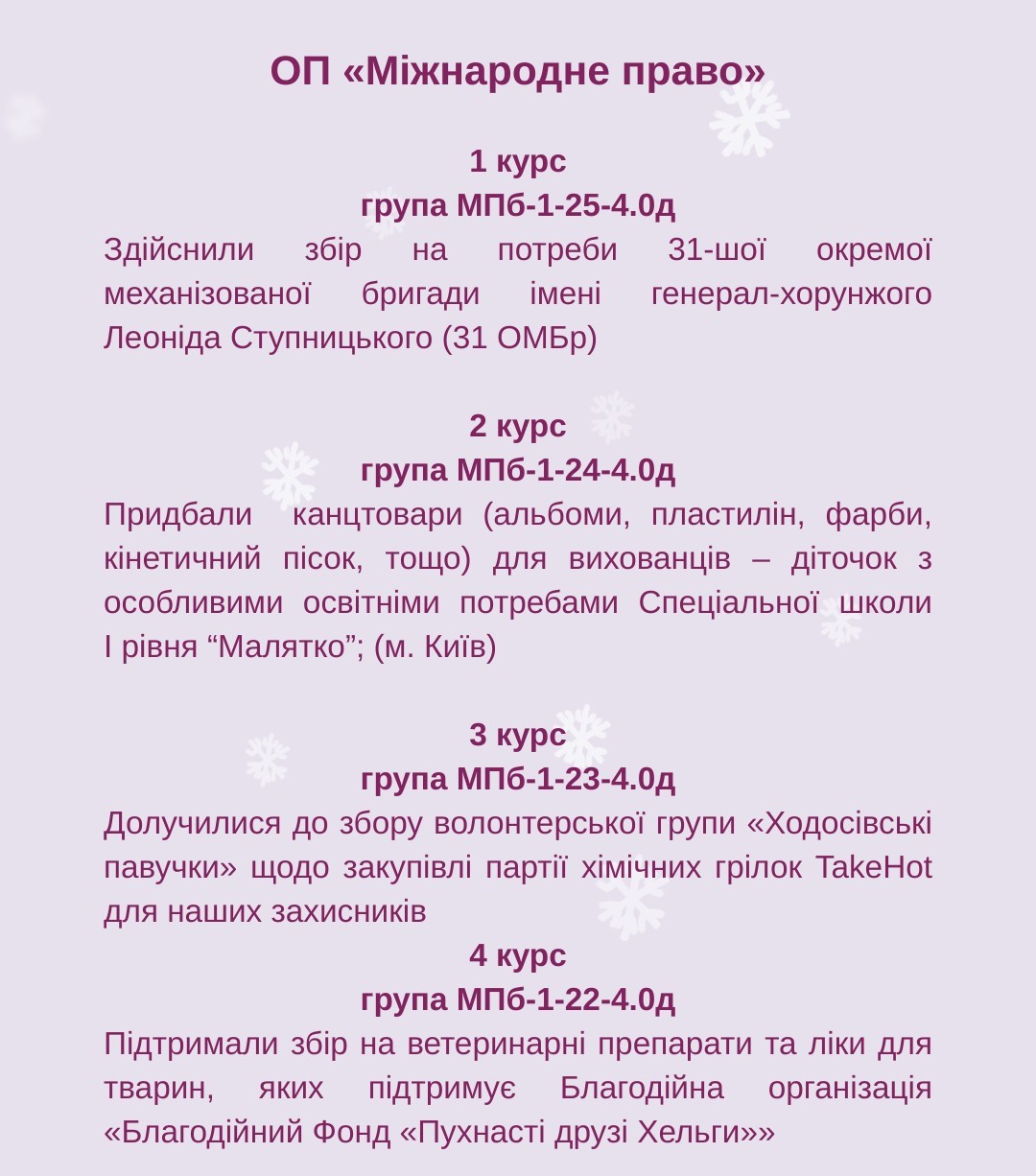 Кожного року, напередодні Різдва Христового, на Факультеті права та міжнародних відносин традиційно відбувається масштабний благодійний Марафон добрих справ. Кожна академічна група обирає саме СВІЙ доброчинний напрям, в межах якого здійснює СВОЮ посильну допомогу та СВОЄ маленьке диво.