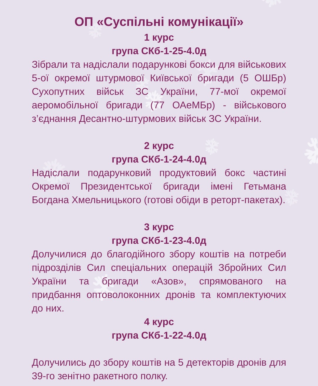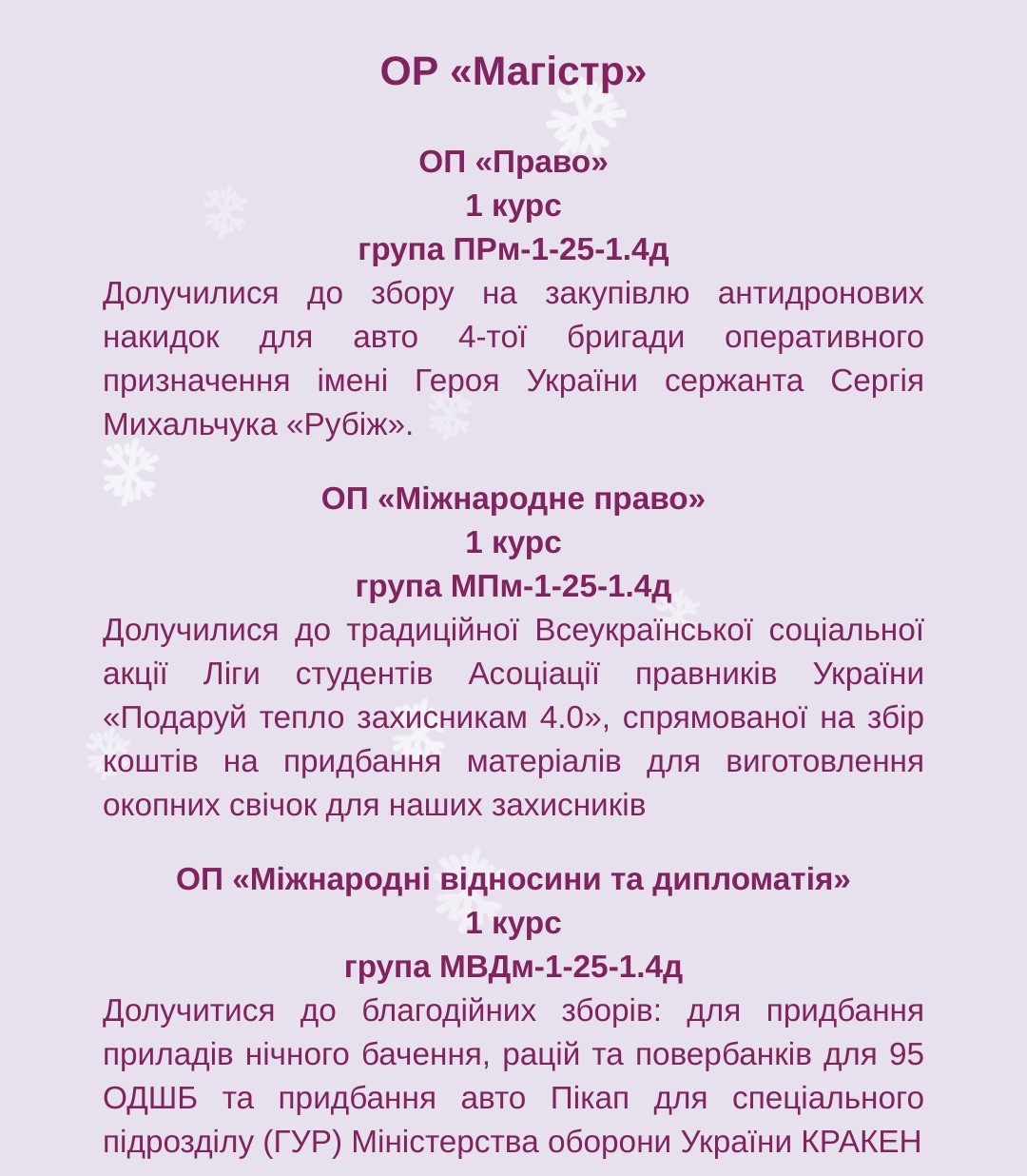 Дякуємо всім нашим студентам за небайдужість та бажаємо, щоб в переддень великого свята саме ВАШЕ диво постукало до вас у двері і подарувало кожному здійснення найзаповітніщих мрій, а наступний 2026 рік приніс всім українцям МИР, на який ми так чекаємо!