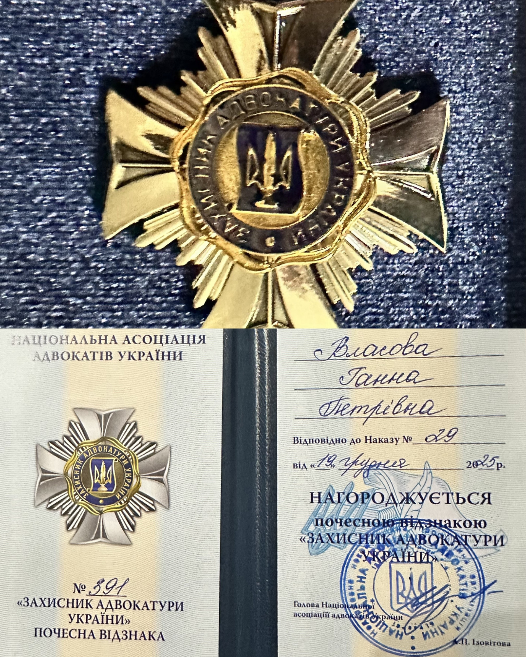 Нагороду вручено відповідно до наказу Національної асоціації адвокатів України, що є визнанням високих професійних стандартів, принципової правової позиції та відданості ідеалам адвокатської діяльності.