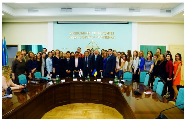 Привітав гостей та студентську спільноту Віктор Огнев’юк, ректор Університету Грінченка. Після вітального слова Надзвичайний і Повноважний Посол Республіки Корея в Україні Лі Янг-Гу прочитав лекцію про три чуда Кореї, національні цінності та духовні ідеали, стратегію співпраці між нашими країнами, а також про необхідність розвитку людського капіталу.
