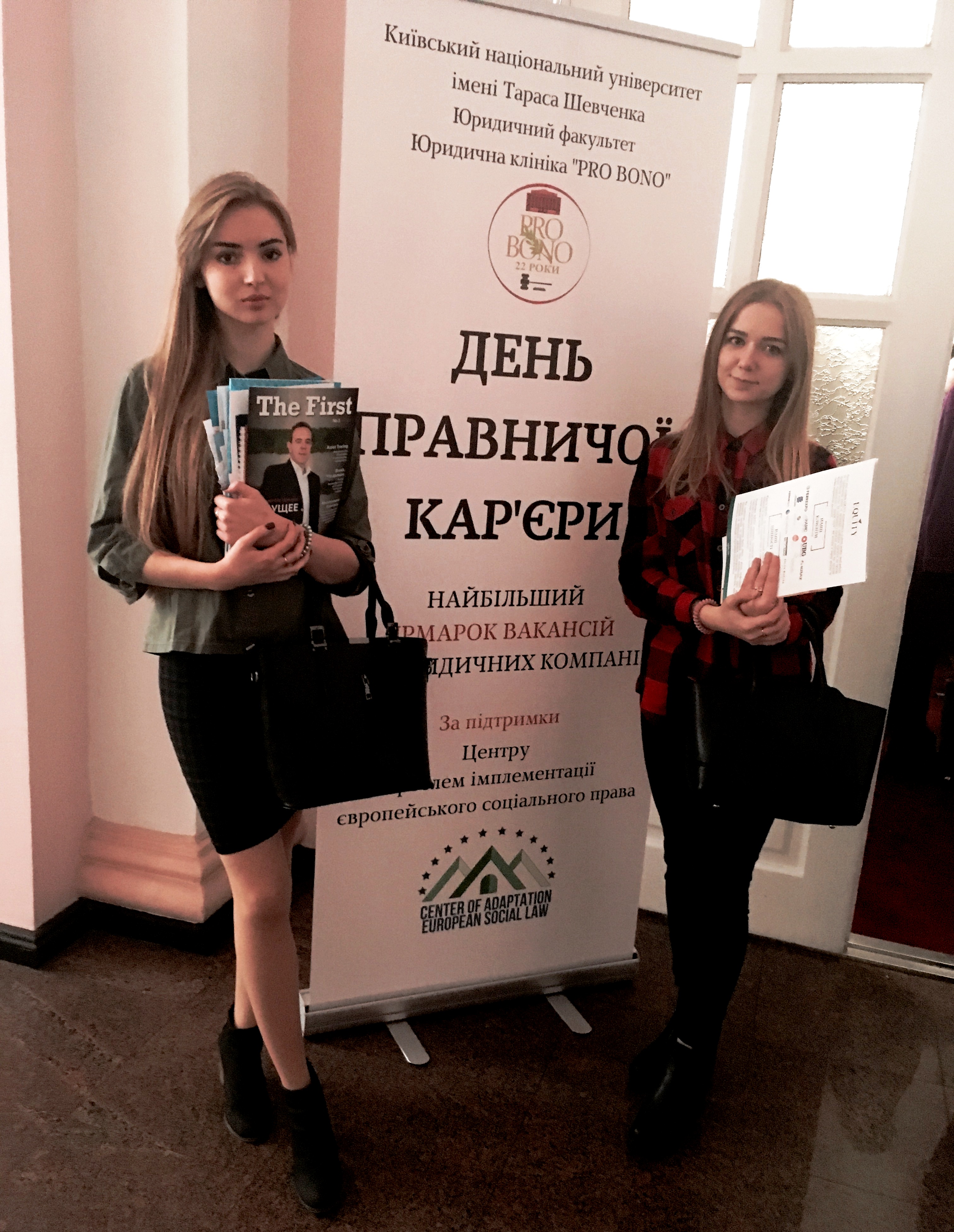 26 жовтня 2017 року студенти спеціальності «Право» Ангеліна Івашкевич та Євгенія Торчинська, на запрошення Юридичної клініки "Pro bono"; Київського національного університету імені Тараса Шевченка та Центру проблем імплементації європейського соціального права, відвідали День правничої кар'єри - традиційний захід, що проводиться з 1997 року.