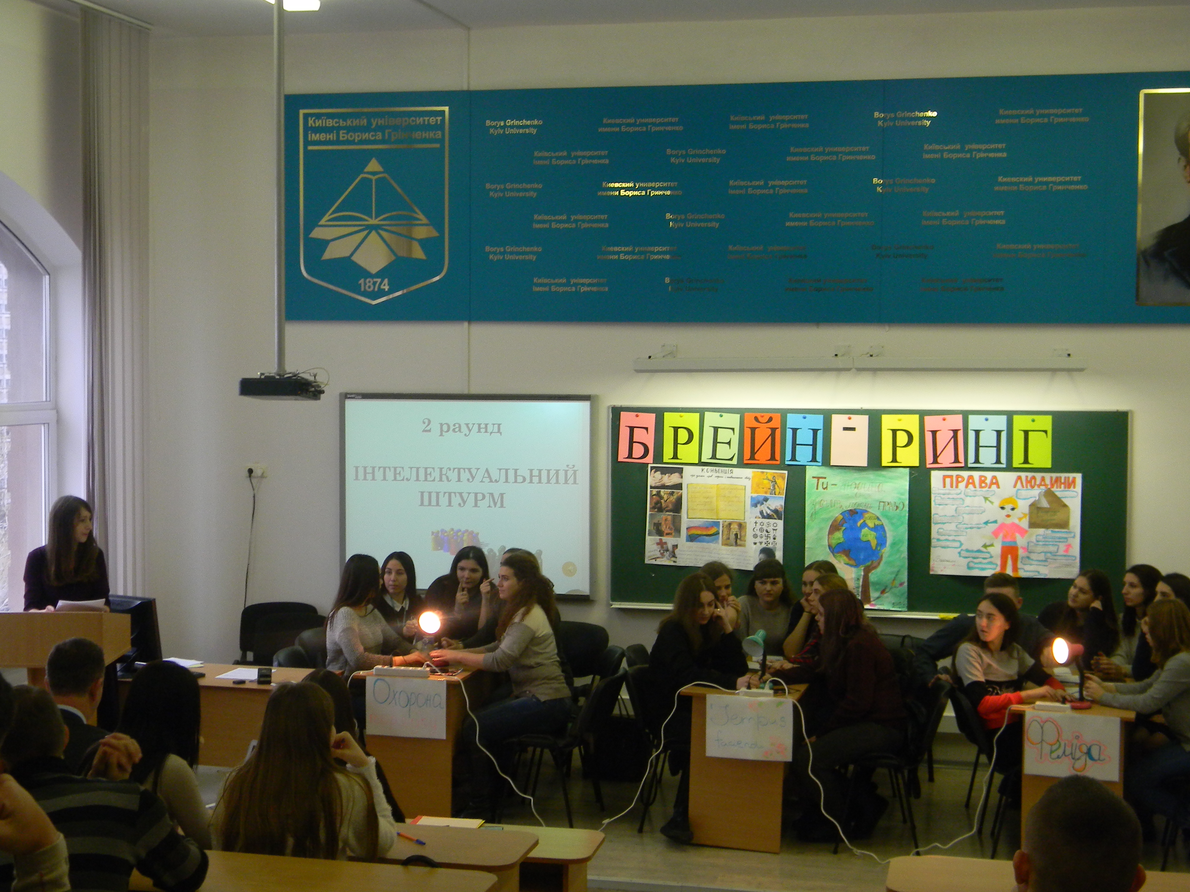 Кожна команда складалася із шести учасників на чолі з капітаном, які виявили неабияку кмітливість, ерудицію та винахідливість у таких раундах: «Привітання», «Інтелектуальний штурм», творчий раунд «Агітатор» та «Правова допомога». Також був проведений тайм-аут для вболівальників – студентів І-ІІ курсів – у вигляді виконання творчого завдання: «Які права людини порушуються в оповіданнях Бориса Грінченка?». Найактивніші вболівальники були нагороджені солодкими подарунками.
