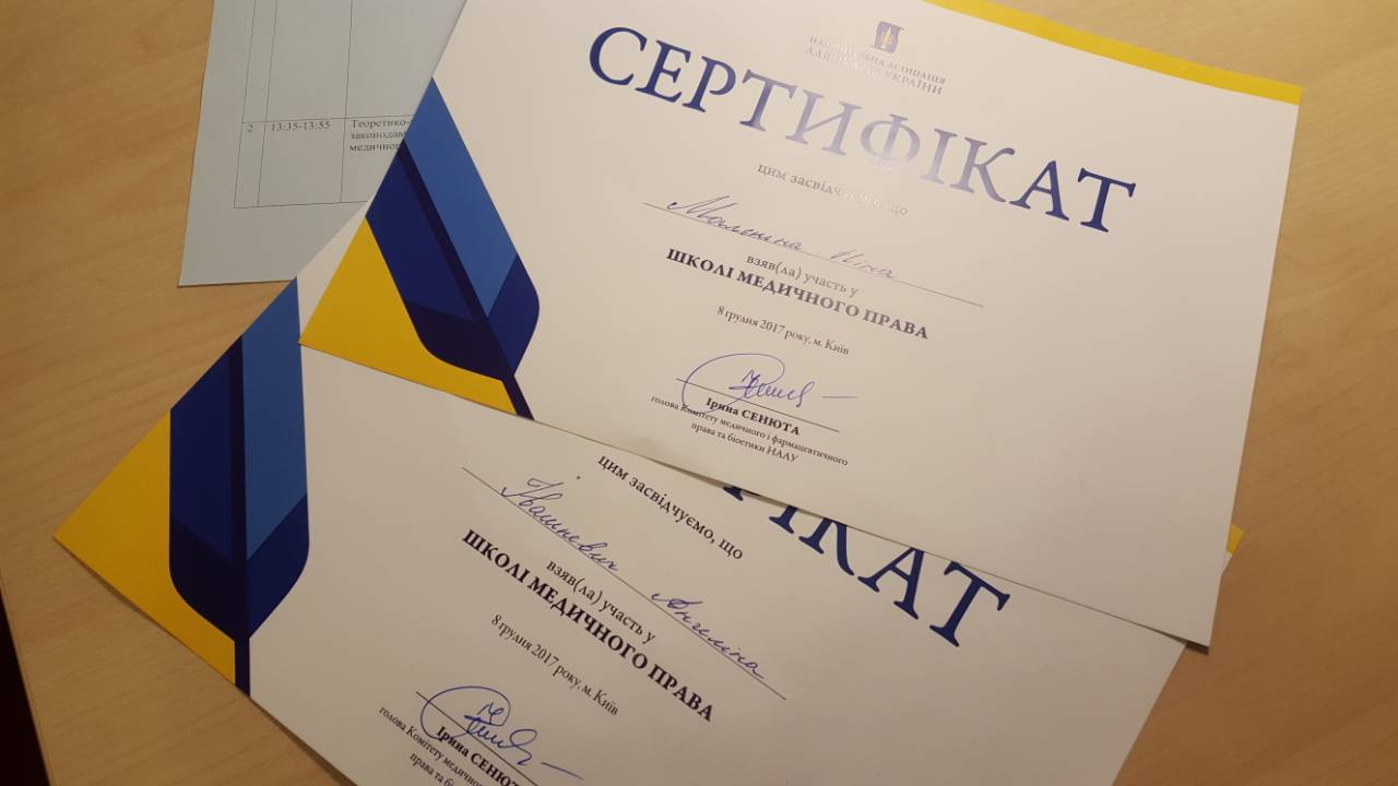 8 грудня 2017 року в рамках діяльності Комітету медичного та фармацевтичного права та біоетики Національної асоціації адвокатів України та Всеукраїнського тижня права відбулась Школа медичного права. Організаторами заходу став Комітет медичного та фармацевтичного права та біоетики Національної асоціації адвокатів України, Центр сімейно-правових досліджень, Центр медичного та репродуктивного права та Секція захисту прав учасників сімейних правовідносин у сфері охорони здоров’я Асоціації адвокатів України.