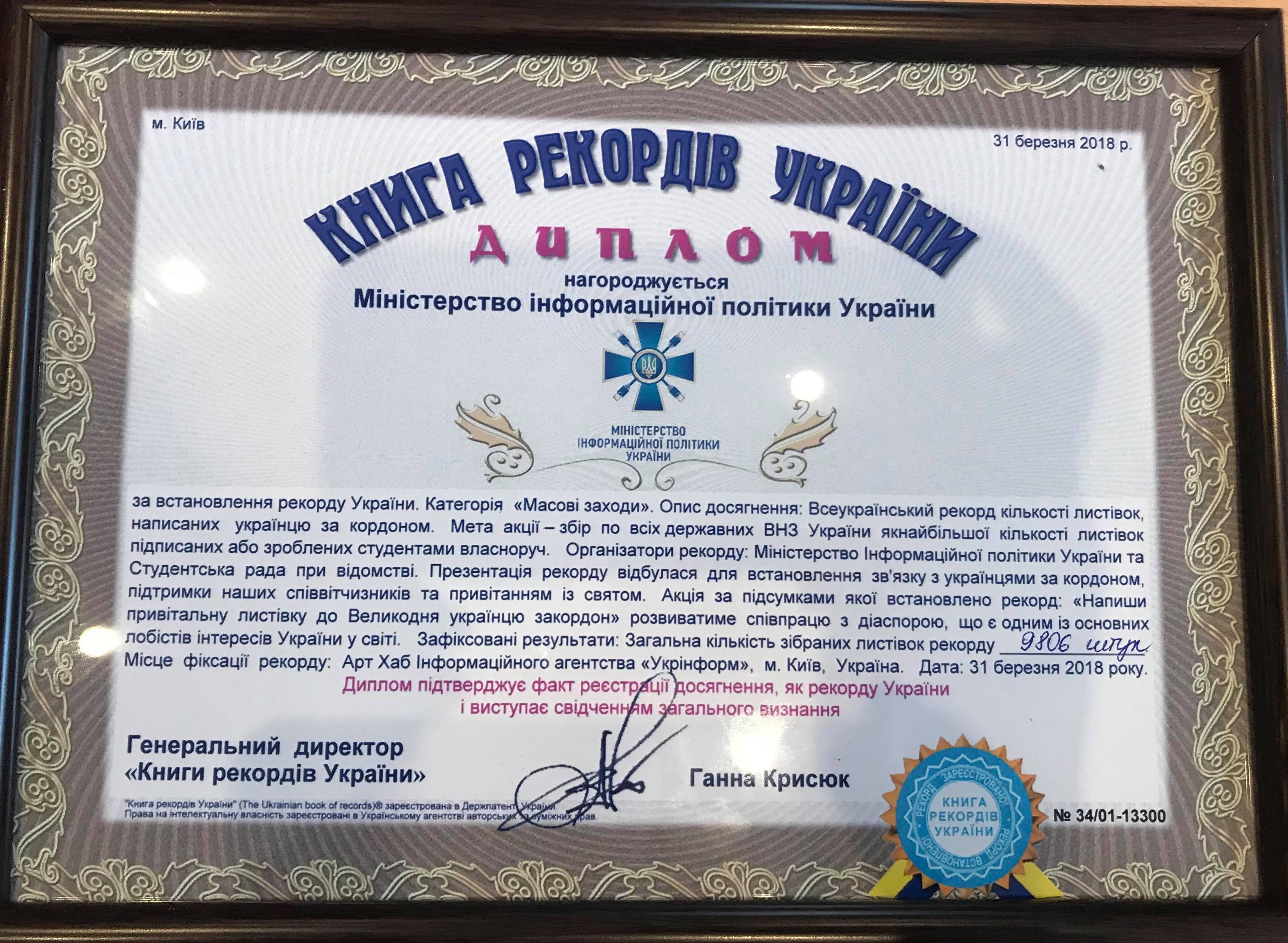 31 березня Голова студентської Ради Факультету Ангеліна Івашкевич та Голова департаменту СР Факультету з розвитку міжнародних проектів Альона Добридень (член Студентської Ради при Міністерстві інформаційної політики України) відвідали інформаційне агентство «Укрінформ» де відбулося встановлення Всеукраїнського рекорду із найбільшої кількості привітальних листівок до Великодня для українців за кордоном у кількості 9806 штук, які студенти вищих навчальних закладів з усієї України підписали або зробили власноруч.
