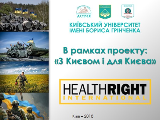 03 листопада 2018 року, на базі Київського університету імені Бориса Грінченка, в рамках соціального проекту «З Києвом і для Києва», представництво в Україні HealthRightInternational – Клініка з прав людини «Право на здоров’я» та колектив ЮК «Астрея» Факультету права та міжнародних відносин Київського університету імені Бориса Грінченка, організували та провели спільний захід зорієнтований на забезпечення доступу до соціально-правової та психологічної допомоги учасникам бойових дій (зони АТО) та членам їхніх родин.