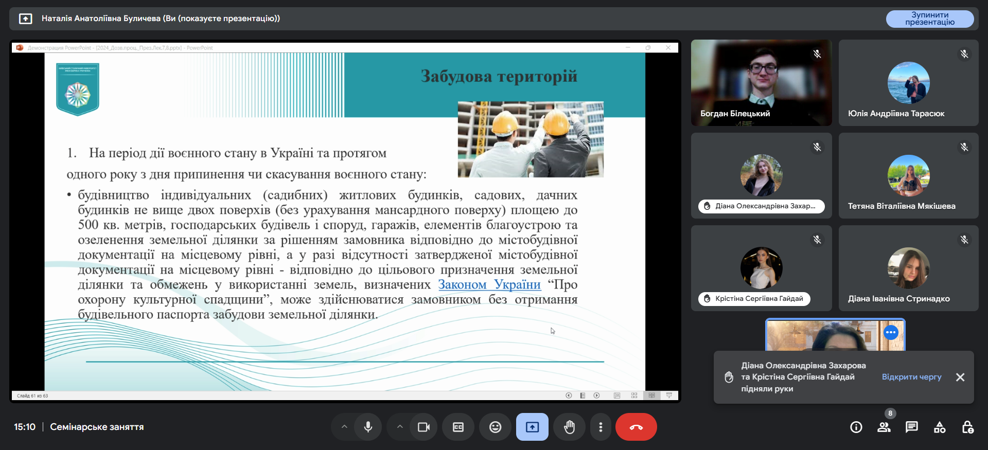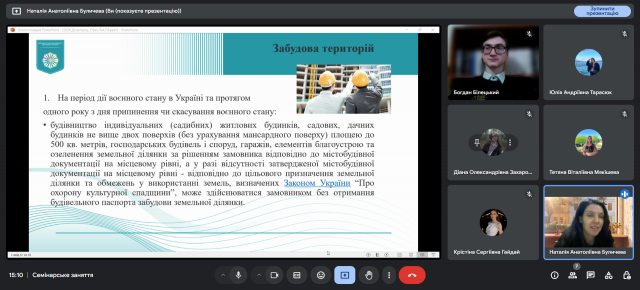27 листопада 2024 в рамках роботи Центру бізнес-права під час семінарського заняття з навчальної дисципліни «Дозвільні процедури в сфері господарської діяльності» на чолі з кандидатом юридичних наук, доцентом Наталією Буличевою проведено наукову дискусію на тему «Особливості здійснення дозвільних та реєстраційних процедур у будівництві в умовах воєнного стану».