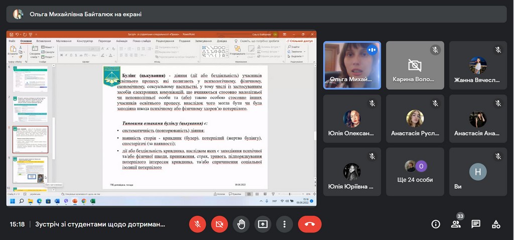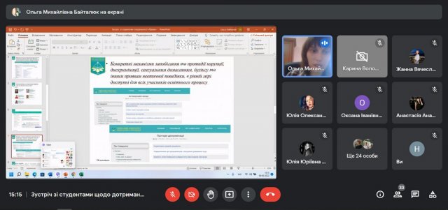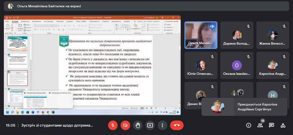 9 червня 2022 року на платформі Google Meet відбулась інформаційна зустріч зі студентами щодо дотримання норм академічної доброчесності, корпоративної культури та запобіганню корупції і проявів булінгу.