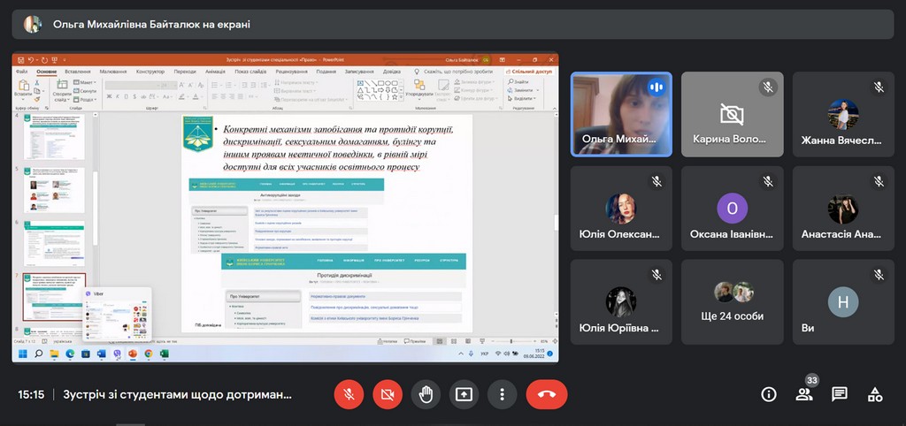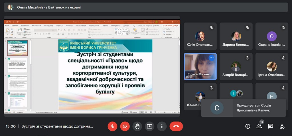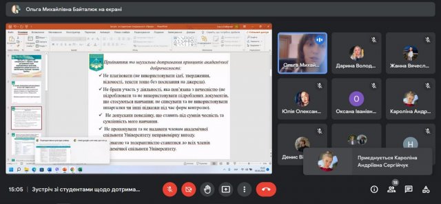 Під час зустрічі було розглянуто основні приписи Положення про академічну доброчесність здобувачів вищої освіти та Кодексу корпоративної культури Київського університету імені Бориса Грінченка. Окрему увагу було приділено неухильному дотриманню принципів академічної доброчесності, окреслено основні принципи корпоративної культури Університету.