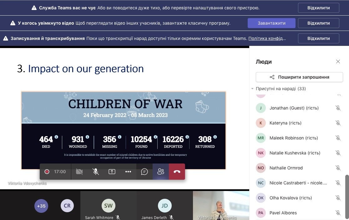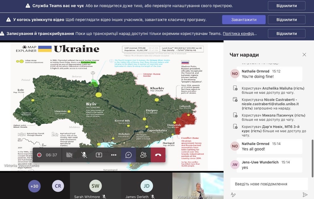 На лекції Вікторія Вдовиченко розглянула питання, пов'язані з повномасштабним російським вторгненням, а також висловила свої перспективи та виклики, що стоять перед Україною в майбутньому. Також були згадані основні трагічні події війни,як почалось російське вторгнення, і як війна неочікувано прийшла в мирні українські міста. Лектор детально розповіла як сильно страждає мирне населення в Україні, і про підтвердженні тисячі військових злочинів скоєнних росіянами. Окрема частина лекції була виділена й на опис буденного життя українців під час війни, і як люди намагаються жити в цих умовах.