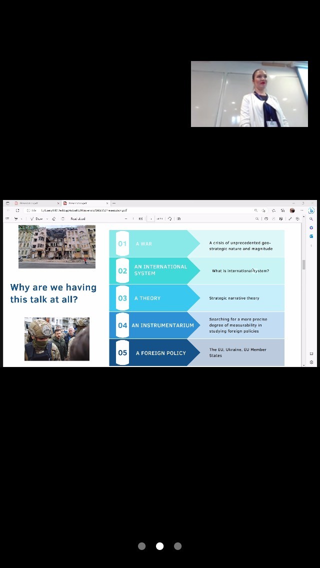 Також було порушено питання міжнародної системи і можливість вимірювання зовнішньої політики як явища. Особливу увагу було приділено таким елементам взаємодії та стратегічного середовища як ідентичність і формування стратегічного наративу про війну в Україні та його відображення з боку ЄС та його держав-членів.