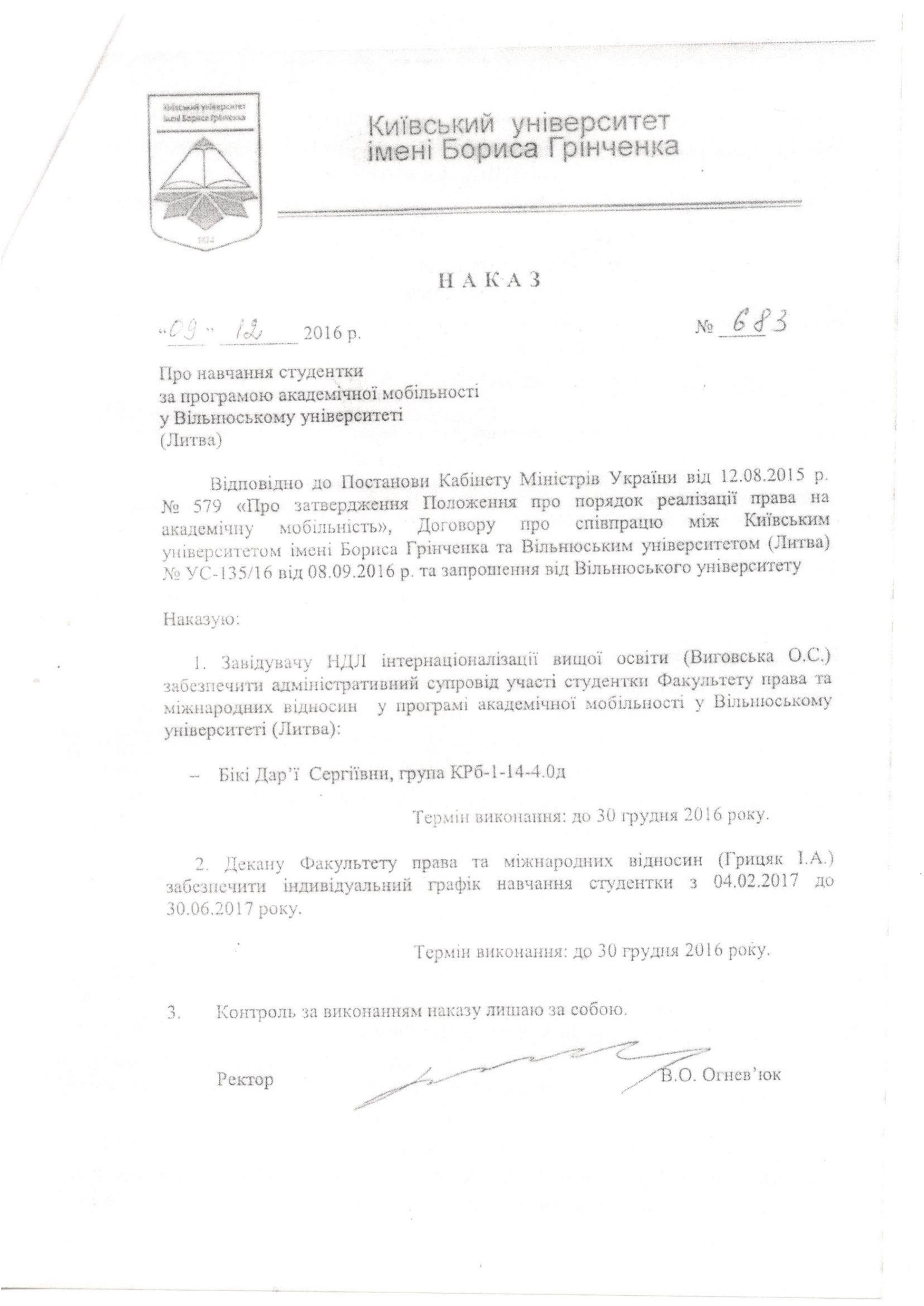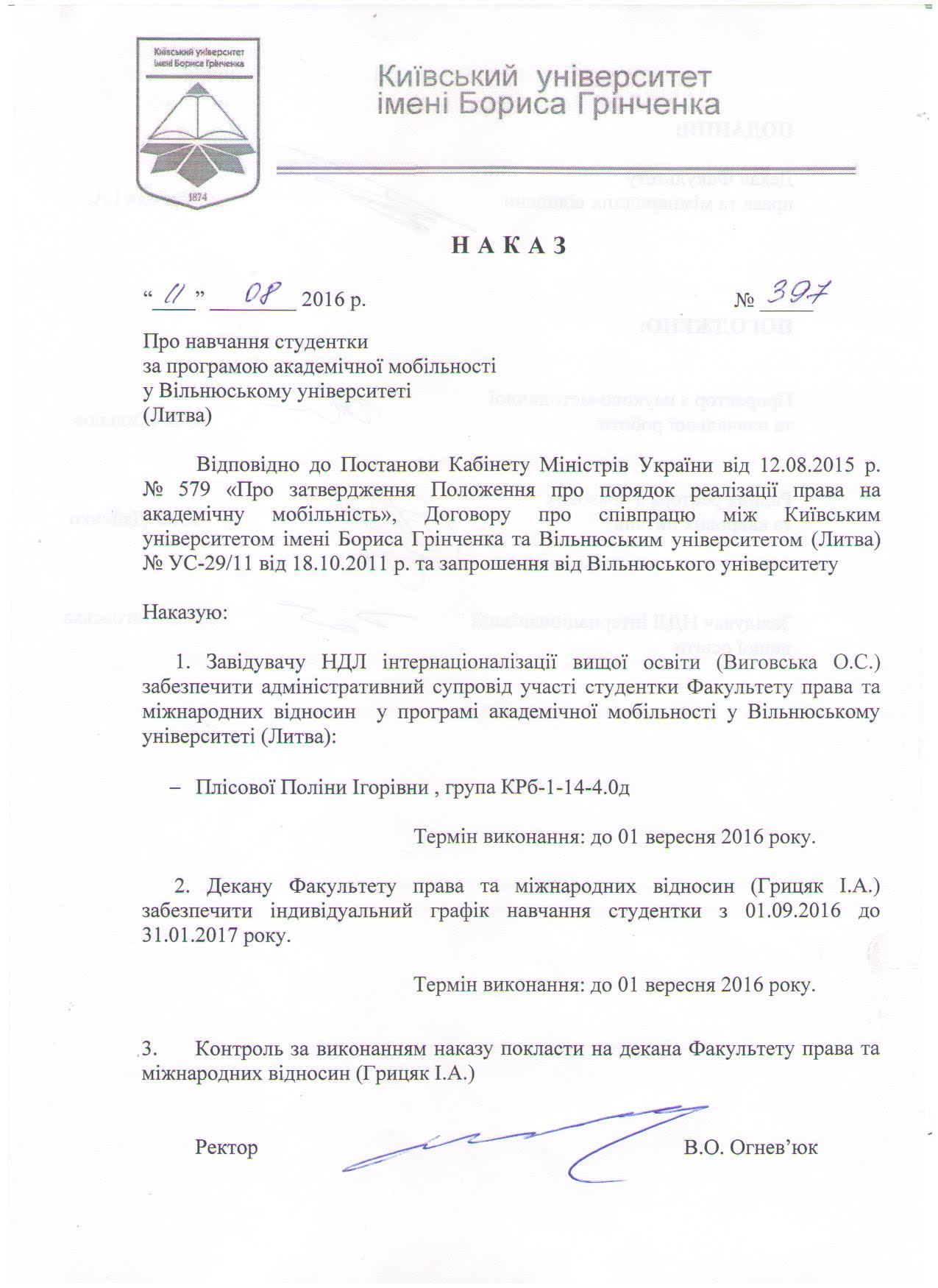 - Відповідно до Постанови Кабінету Міністрів України від 12.08.2015 року №579 «Про затвердження Положення про порядок реалізації права на академічну мобільність», Договору про співпрацю між Київським університетом імені Бориса Грінченка та Вільнюським університетом (Литва) № УС-29/11 від 18.10.2011 р. та запрошення від Вільнюського університету студентка 3 курсу спеціальності «Країнознавство» Поліна Ігорівна Плісова навчалась за програмою академічної мобільності з 01.09.2016 р. до 31.01.2017р.