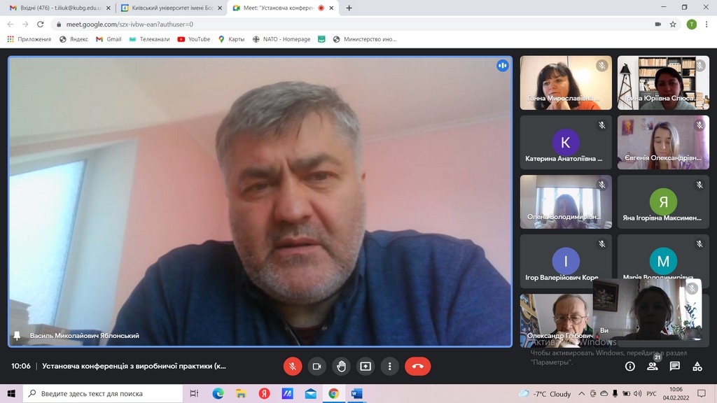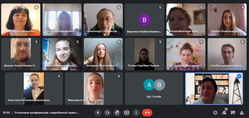 04 лютого 2022 р. на платформі Google Meet відбулася установча конференція напередодні виробничої практики (консульська робота) студентів 4 курсу першого (бакалаврського) рівня вищої освіти спеціальності «Міжнародні відносини, суспільні комунікації та регіональні студії» освітньої програми «Суспільні комунікації». Практика проводиться відповідно до Положення про проведення практики студентів Київського університету імені Бориса Грінченка. Виробнича практика, присвячена консульській роботі, спрямована на оволодіння сучасними методами, формами організації та навичками праці в галузі міжнародних відносин; формування професійних умінь для прийняття самостійних рішень під час вирішення практичних завдань у консульській роботі; формування навичок виконавчої діяльності працівника консульської служби, професійних вмінь використання технічних і програмних засобів в їх майбутній професії. На установчій конференції були присутні студенти та керівники практики від кафедри міжнародних відносин та міжнародного права. Організувала та провела установчу конференцію доцент кафедри, кандидат наук з державного управління Пістракевич Олена.