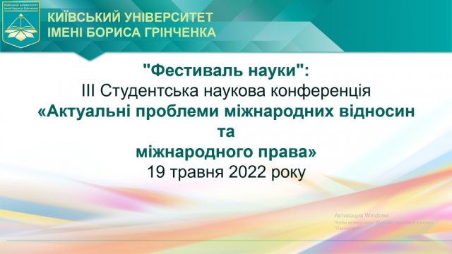19 травня 2022 року в рамках Фестивалю науки Київського університету імені Бориса Грінченка на Факультеті права та міжнародних відносин в онлайн форматі відбулася щорічна студентська наукова конференція «Актуальні проблеми міжнародних відносин та міжнародного права».