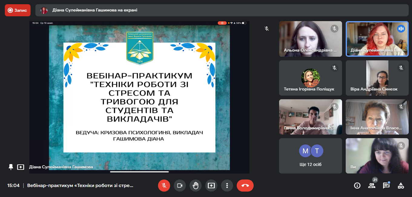 19 жовтня 2022 року у рамках діяльності Школи кураторів кандидат історичних наук, доцент, заступник завідувача кафедри міжнародних відносин Мельник Ганна Мирославівна взяла участь у роботі онлайн вебінар-практикуму “Техніки роботи зі стресом та тривогою для студентів та викладачів”, який провела кризова психологиня і викладач Гашинова Діана Сулеймівна.