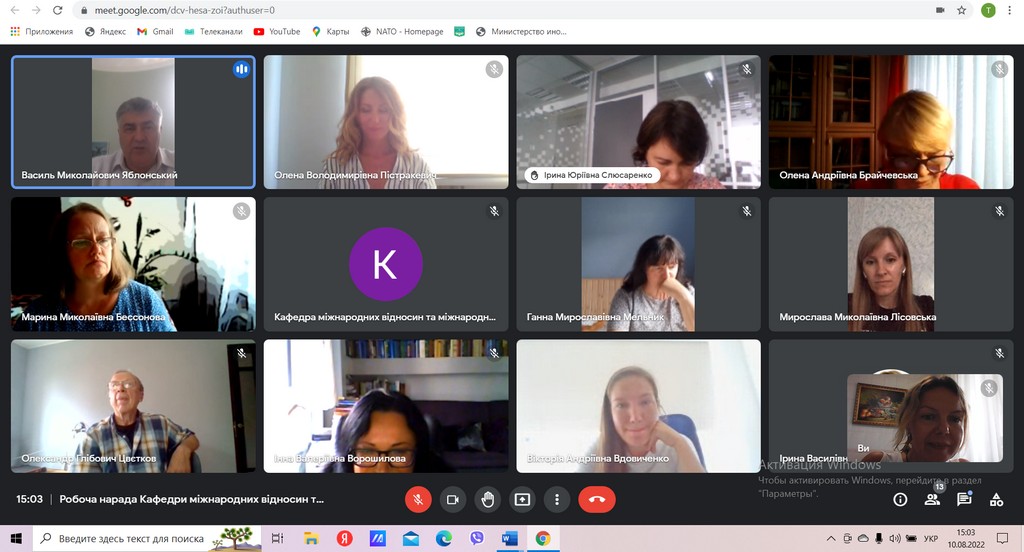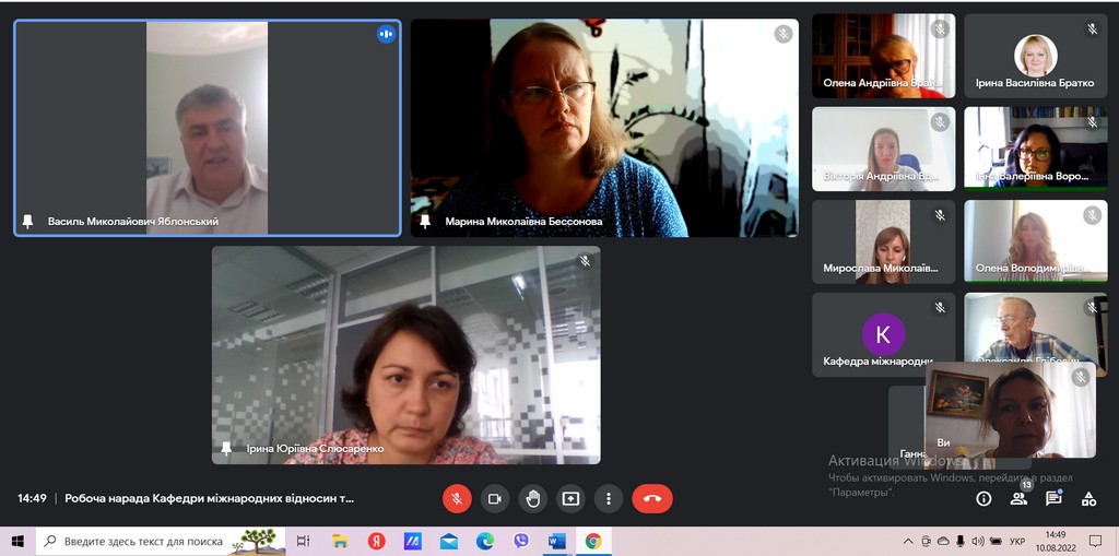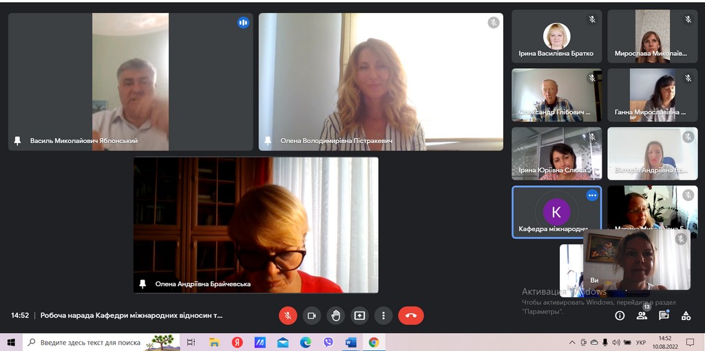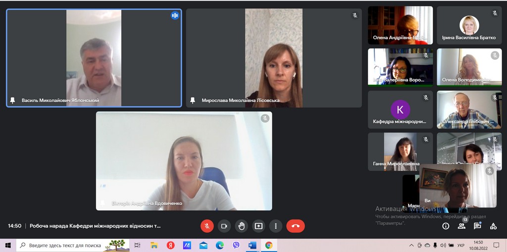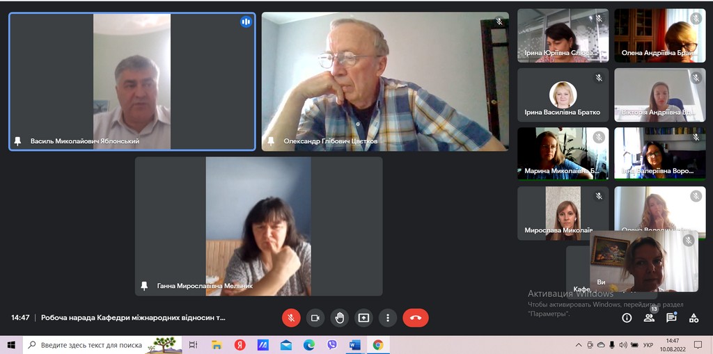 10 серпня 2022 року відбулося засідання кафедри міжнародних відносин та міжнародного права. Під час засідання було обговорено робочі питання діяльності кафедри, проблеми проведення вступної кампанії та окремі аспекти удосконалення освітніх програм “Суспільні комунікації” і “Регіональні студії”. Приємно констатувати, що попри усі труднощі воєнного часу, склад кафедри активно працює та демонструє чудові результати.