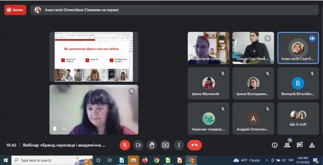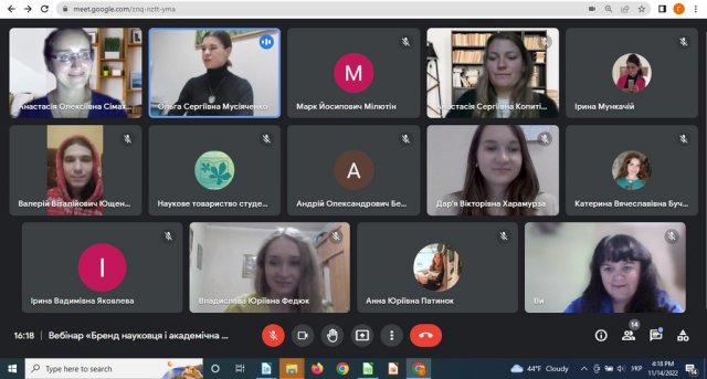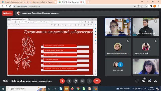 14 листопада 2022 року кандидат історичних наук, доцент, заступник завідувача кафедри міжнародних відносин Мельник Ганна Мирославівна взяла участь у роботі онлайн вебінару «Бренд науковця і академічна доброчесність», який провела Сімахова Анастасія, д.е.н., доцент, професор кафедри бізнес-аналітики та цифрової економіки Національного авіаційного університету, перший заступник Голови Ради молодих учених при МОН України, заступник Голови Офісу підтримки вченого.