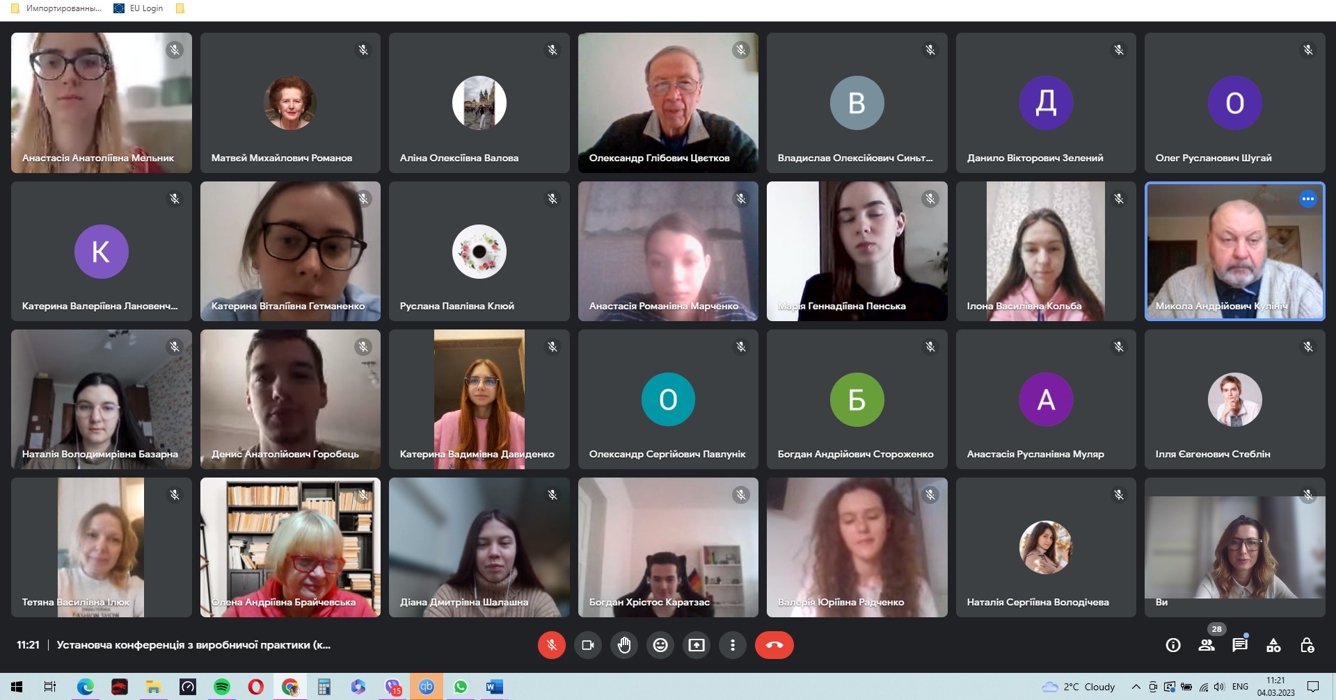 04 березня 2023 року відбулася установча конференція з виробничої практики (консульська робота) студентів 4 курсу першого (бакалаврського) рівня вищої освіти спеціальності «Міжнародні відносини, суспільні комунікації та регіональні студії» освітньої програми «Суспільні комунікації». В ході конференції здобувачів було ознайомлено з метою і завданнями практики; з базами практики, на яких студенти матимуть можливість спробувати практичні навики роботи; з керівниками практики, а також з обов’язками як студентів, так і керівників. Надано було також методичні рекомендації та пояснення щодо завдань для самостійної роботи.