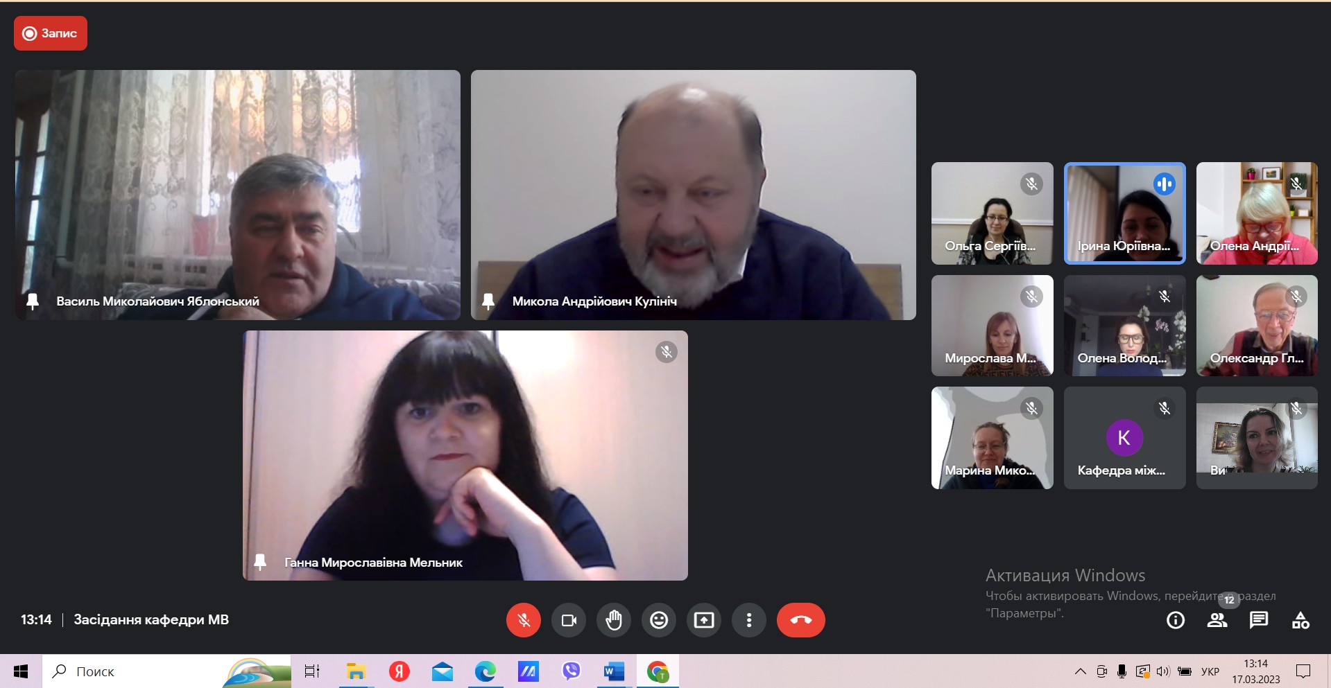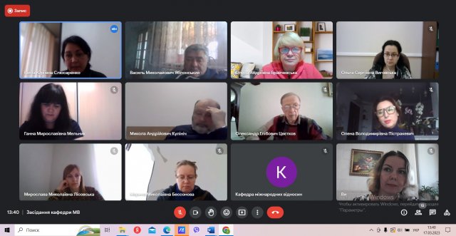 17 березня 2023 року відбулося засідання кафедри міжнародних відносин. Під час засідання було обговорено робочі питання діяльності кафедри, затверджено методичні рекомендації з написання курсових, бакалаврських і магістерських робіт в рамках освітніх програм “Суспільні комунікації” і “Регіональні студії” першого (бакалаврського) та другого (магістерського) рівнів вищої освіти, розглянуто питання дотримання академічної доброчесності в освітньому процесі та інші.