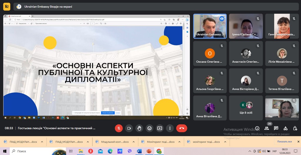 12 квітня 2023 року відбулася гостьова онлайн-лекція Третього секретаря Посольства України в Республіці Північна Македонія, PhD Володимира Вербицького на тему «Основні аспекти та практичний вимір публічної дипломатії: український досвід» для студентів ОП «Суспільні комунікації» першого (бакалаврського) освітнього рівня із залученням студентів ОП «Регіональні студії» та студентів другого (магістерського) освітнього рівня.