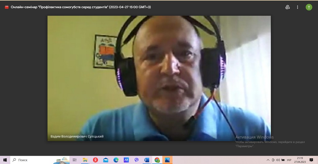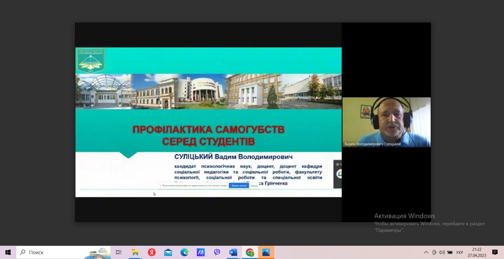 27 квітня 2023 року в рамках діяльності Школи кураторів Київського університету імені Бориса Грінченка, кандидат історичних наук, доцент кафедри міжнародних Тетяна Ілюк взяла участь у онлайн-семінарі "Профілактика сомогубств серед студентів". Для кураторів академічних груп практичний онлайн-семінар провів Вадим Суліцький, кандидат психологічних наук, доцент, доцент кафедри соціальної педагогіки та соціальної роботи, факультету психології, соціальної роботи та спеціальної освіти КУБГ. Щиро дякуємо тренеру за цікавий та корисний тренінг із такої складної та, на жаль, актуальної тематики та корисні поради щодо ефективної взаємодії у критичних ситуаціях.