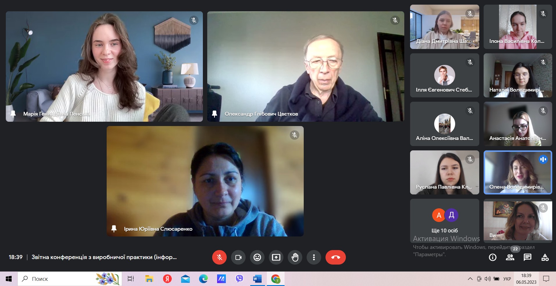 06 травня 2023 року відбулася звітна конференція проходження виробничої практики (інформаційно-аналітична робота) для студентів 4 курсу освітньої програми "Суспільні комунікації". Під час звітної конференції студенти прозвітували про форми роботи та завдання, які вони виконували під час практики, обговорили компетентності та навички, які отримали при виконанні завдань, розповіли про свої враження від проходження практики. Практика проходила з 06 квітня по 06 травня 2023 року на базі ГО «Пан’європейський союз України», ГО «Європейський інститут», ГО «Дипломатія в дії», Відділ апостилю, нотаріату та витребування Управління консульських послуг Департаменту консульської служби, Подільський районний у м. Києві відділ фізичного здоров’я населення «Спорт для всіх», Адвокатське Бюро «Сергія Ігольнікова», ТОВ «Хелзджой» та ТОВ «Джубл». Конференція відбулася на платформі Google Meet. Участь в конференції прийняли студенти 4-го року навчання першого (бакалаврського) рівня вищої освіти ОП «Суспільні комунікації» та керівники практики від університету. Організувала та провела конференцію кандидат наук з державного управління, доцент кафедри міжнародних відносин Олена Пістракевич. Підводячи підсумки проходження практики в умовах війни, варто відмітити, що студенти зуміли показати високий рівень професійної підготовки, вміння використовувати здобуті у процесі навчання навики на практиці та чудово впоралися із виконанням практично значущих завдань.