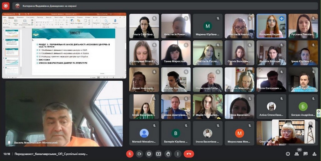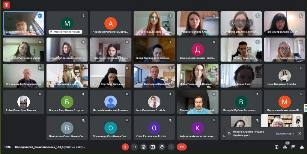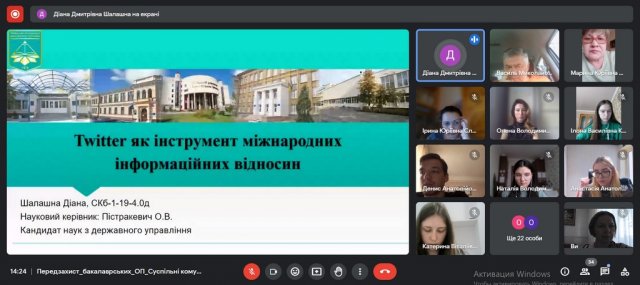 10 травня 2023 року відбулося засідання кафедри міжнародних відносин, під час якого було проведено попередній захист бакалаврських робіт студентів 4- го курсу освітньої програми “Суспільні комунікації”. З приємністю констатуємо, що попри усі труднощі воєнного часу, студенти активно працюють над бакалаврськими роботами і демонструють чудові результати у цей непростий час. Участь в засіданні взяли завідувач кафедри Василь Яблонський, професорсько-викладацький склад кафедри та студенти освітньої програми «Суспільні комунікації» 4-го року навчання бакалаврату. Тримаємо освітній фронт разом!