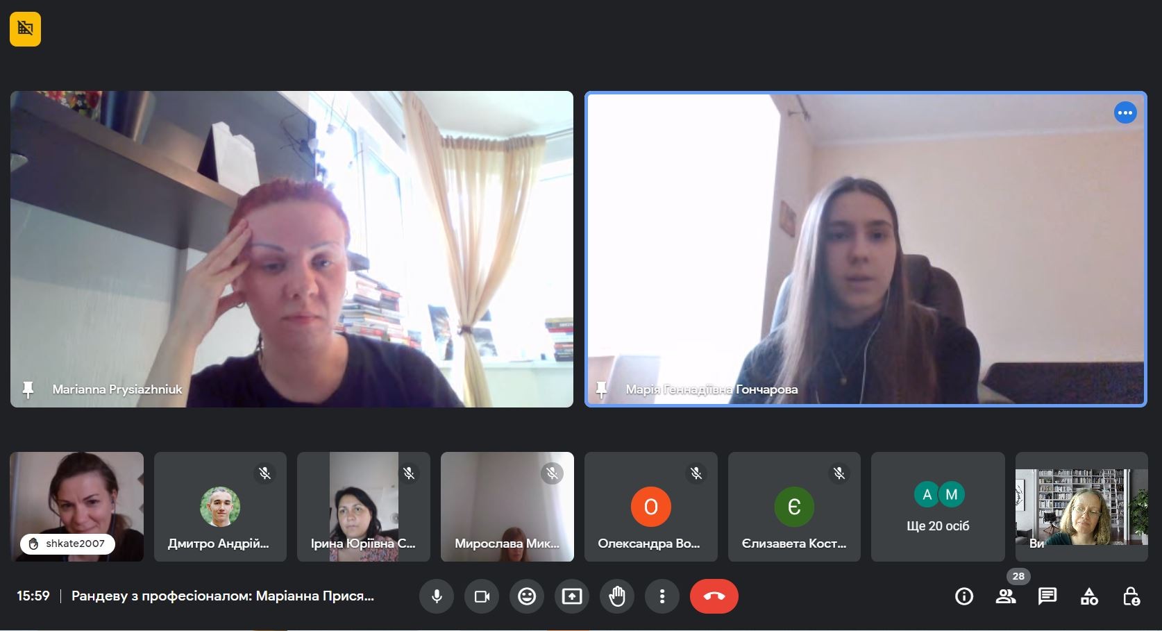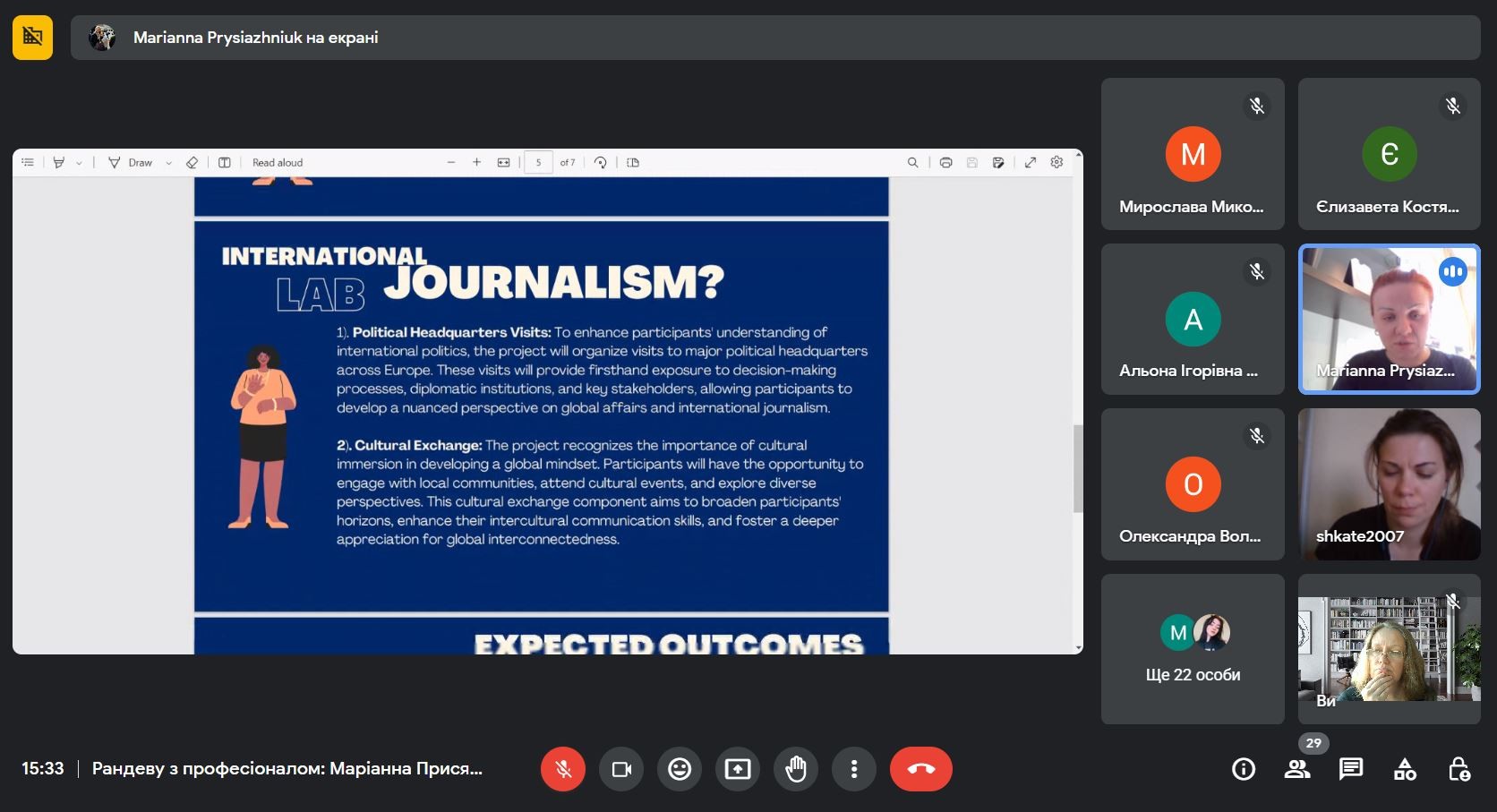 02 червня 2023 р. в рамках ініціативи кафедри міжнародних відносин «Рандеву з професіоналом» відбулася онлайн зустріч здобувачів бакалаврських ОП «Суспільні комунікації» та «Регіональні студії» з Маріанною Присяжнюк, журналісткою видання Главком та учасницею проєкту StopFake. Пані Маріанна розповіла нашим студентам про свій досвід співпраці з українськими, румунськими, німецькими, молдовськими ЗМІ, про дослідження феномену пропаганди й дезінформації, про роботу над книгою «Війна в Європі. Україна, Румунія, Республіка Молдова та агресія РФ», яку пані Маріанна написала спільно з професором Бухарестського університету Раду Карпом. Студенти дізналися про особливості комунікації, які супроводжують міжнародні відносини, про важливі професійні компетентності, необхідні для того, аби стати конкурентоспроможними на ринку праці. Під час зустрічі студентів ознайомили з можливостями участі у міжнародному проєкті «The International Journalism Lab», спрямованому на формування у майбутніх фахівців-міжнародників та фахівців з міжнародних комунікацій необхідних навичок, знань та досвіду для роботи за кордоном та аналітичної та інформаційної роботи, присвяченої глобальним подіям. Цей проект є однією з ініціатив Балкансько-Української мережі співпраці, співзасновниця якої Катерина Шимкевич також завітала на онлайн зустріч. Під час «Рандеву» студенти мали можливість задати питання, які їх цікавили. До цієї зустрічі долучилася й викладачі кафедри – доцент кафедри Мирослава Лісовська, та гаранти бакалаврських освітніх програм Ірина Слюсаренко та Марина Бессонова, яка і ініціювала зустріч.