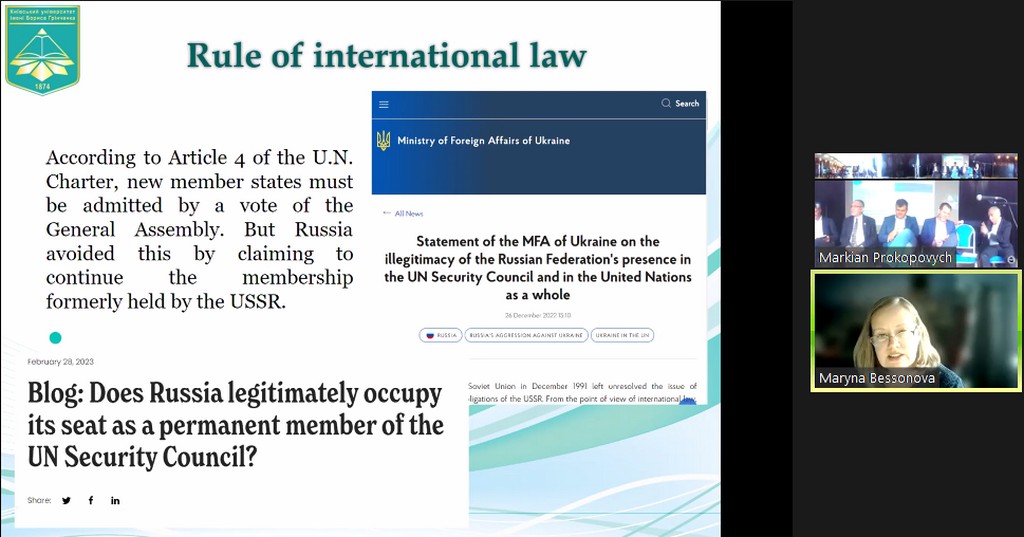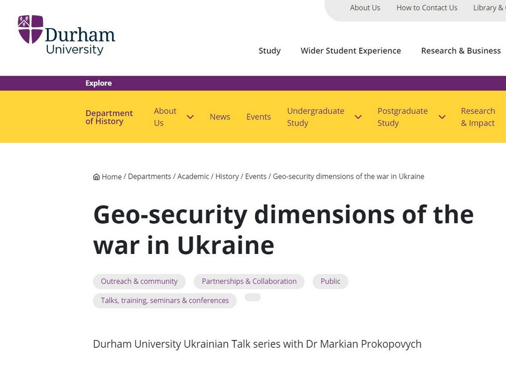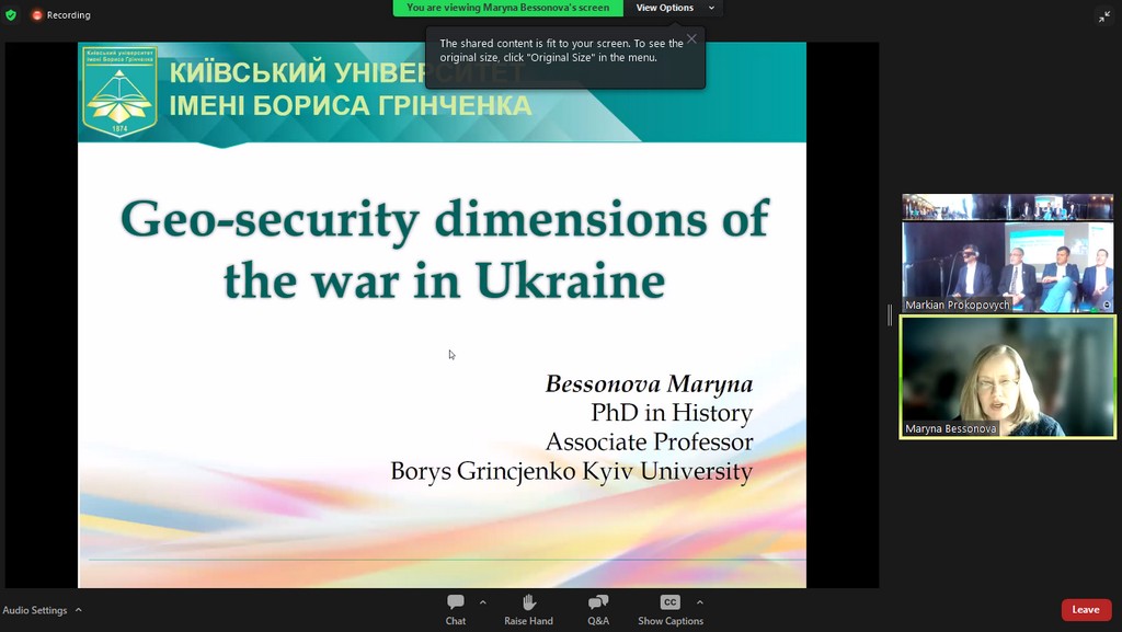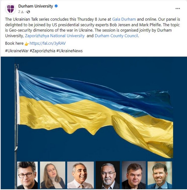 “Ukrainian Talks” – це серія зустрічей у змішаному форматі, покликана привернути увагу до проблематики російсько-української війни. 08 червня 2023 р. відбулася панельна дискусія на тему «Geo-security dimensions of the war in Ukraine», присвячена змінам у глобальних вимірах питань безпеки, в якій взяла участь Марина Бессонова, доцент кафедри міжнародних відносин Київського університету імені Бориса Грінченка. Ідея проєкту та координація його проведення належить професору Даремського університету (Durham University) Маркіяну Прокоповичу, який зміг зібрати цікавих спікерів з України, Великої Британії, США тощо. “Ukrainian Talks” – один з вимірів підтримки України, завдяки якому британське академічне середовище сприяє поширенню українських інтерпретацій російсько-української війни та обговоренню наслідків російської агресії для України та світу. Цей проєкт – один з прикладів співпраці між Даремським та Запорізьким національним університетами, завдяки академічним контактам з останнім кафедра міжнародних відносин також долучилася до цього проєкту.