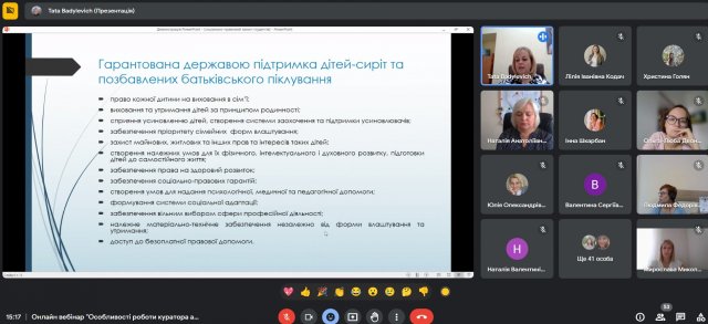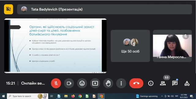 Актуальну тему представила Тетяна Бадилевич, завідувачка юридичного сектору Служби у справах дітей та сім'ї міста Києва. Особлива увага була приділена правовим аспектам соціального захисту студентів. В аудиторії виникла низка запитань, на які люб’язно відповіла лекторка, наводячи приклади з реального життя дітей-сиріт та дітей, позбавлених батьківського піклування, які є студентами.