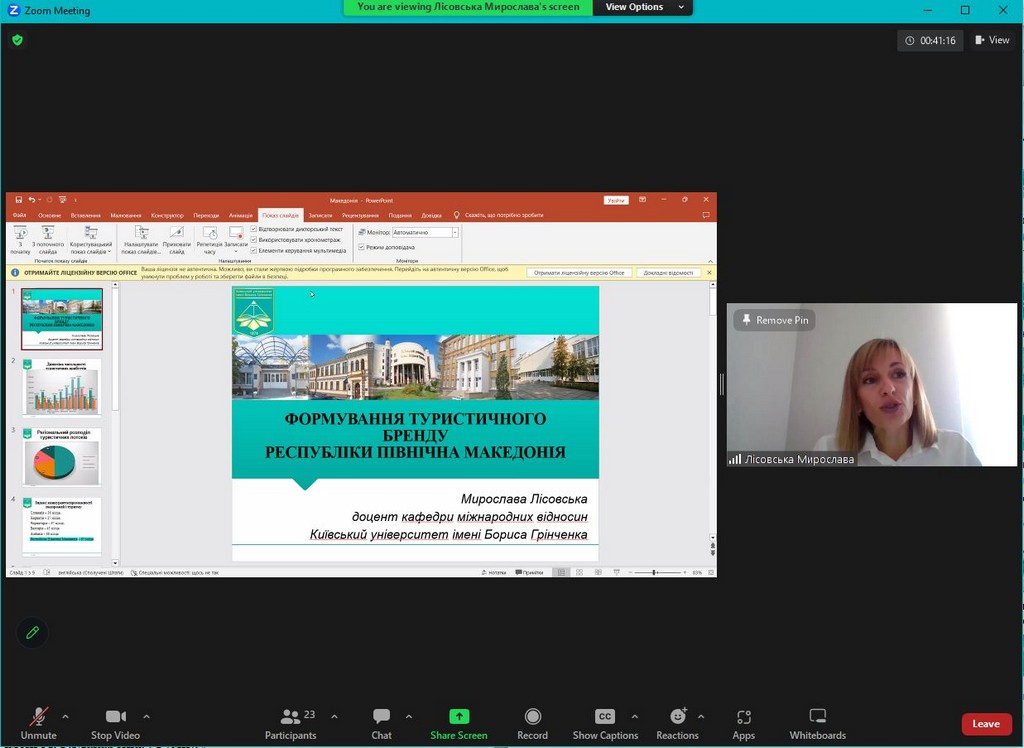 11 жовтня 2023 р. доцентки кафедри міжнародних відносин Київського університету імені Бориса Грінченка Ірина Юріївна Слюсаренко, Мирослава Миколаївна Лісовська та Марина Миколаївна Бессонова взяли участь у презентації своїх доробків у колективній монографії «Республіка Північна Македонія: погляд з України», ініційованій колегами Факультету історії иа міжнародних відносин Запорізького національного університету.