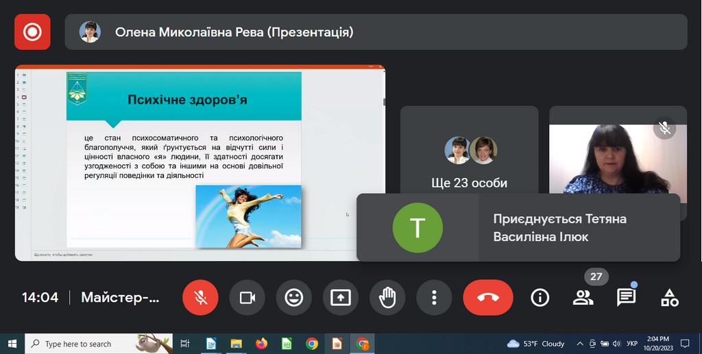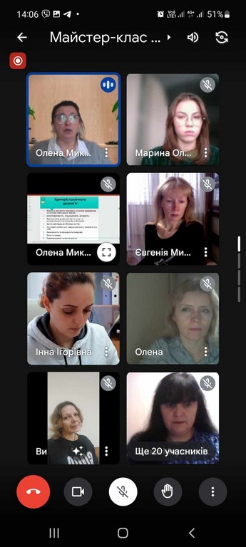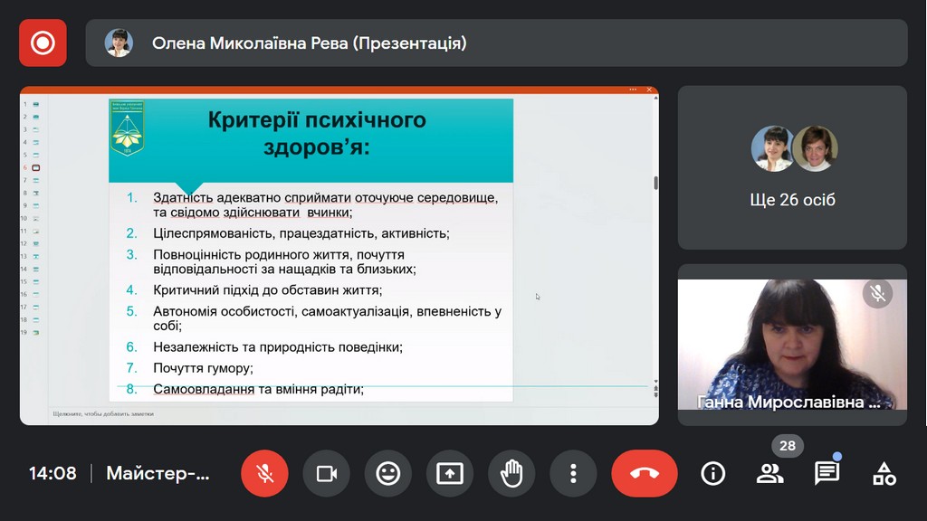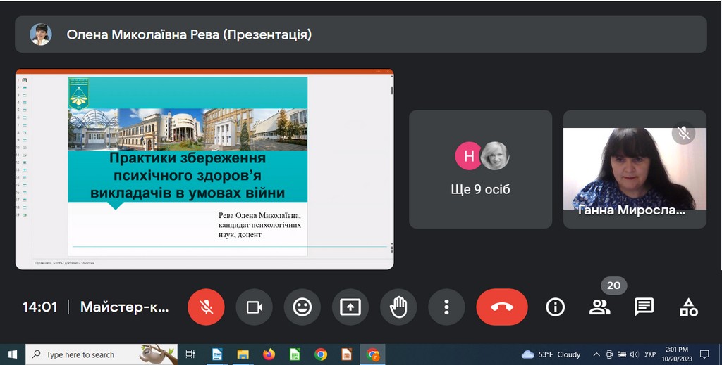 Олена Рева , доцент кафедри психології особистості та соціальних практик Факультету психології, соціальної роботи та спеціальної освіти провела тренінг для викладачів щодо практик самозбереження в умовах війни, ознайомила присутніх з практиками оптимізації власного ресурсу за великого психологічного навантаження в умовах воєнного часу, відпрацювала з присутніми технології психологічної підтримки та стабілізації свого емоційного стану.