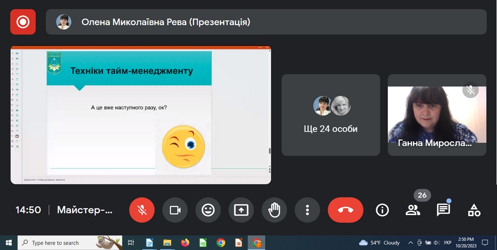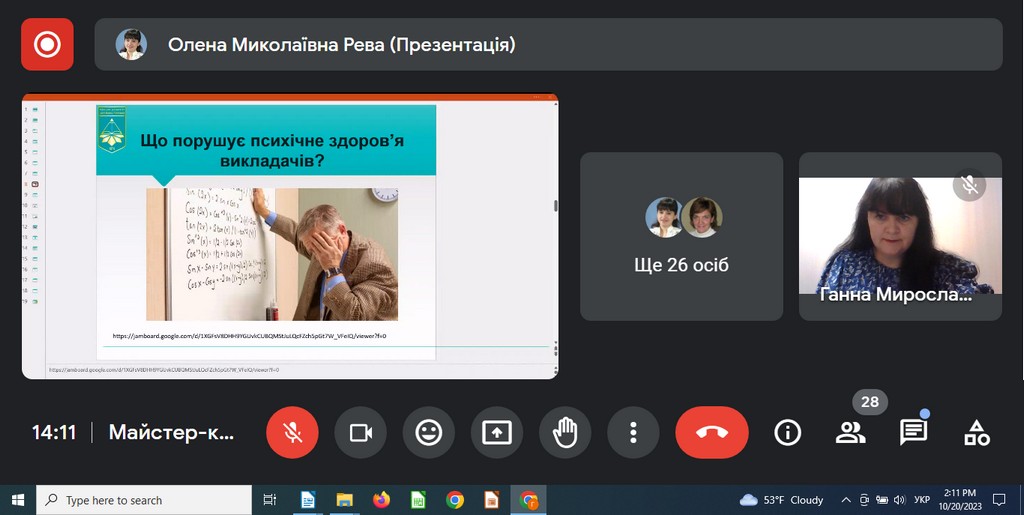 20 жовтня 2023 року доценти кафедри міжнародних відносин, к.і.н Ганна Мельник та к.і.н. Тетяна Ілюк взяли участь у тренінгу "Практики збереження психічного здоров’я викладачів в умовах війни", який проводився в рамках «Школи кураторів».