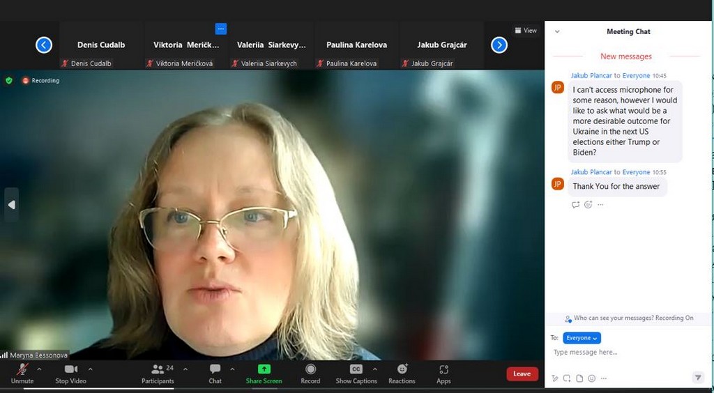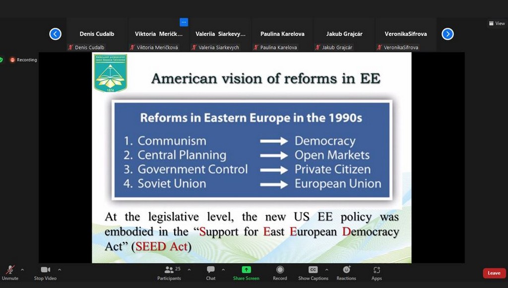 Матеріали лекції побудовані на результатах індивідуального наукового дослідження М.М. Бессонової на тему «Зовнішня політика США та Канади: східноєвропейський вектор». Лекцію, проведену в онлайн форматі англійською мовою відвідали доценти кафедри міжнародних відносин Ірина Юріївна Слюсаренко, Олена Володимирівна Пістракевич та Мирослава Миколаївна Лісовська. Наприкінці лекції були обговорені формати потенційної співпраці Факультету права та міжнародних відносин з Факультетом соціальних та економічних наук Університету Коменського в Братиславі (Словаччина).