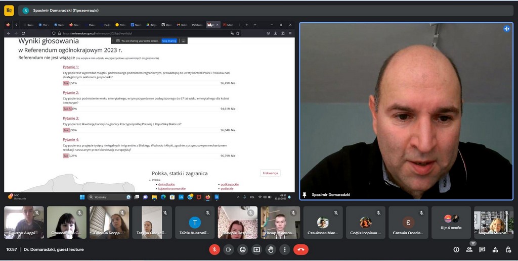 30 жовтня 2023 р. в рамках вибіркової дисципліни «Ретроспектива розвитку Західної Європи та Північної Америки» відбулася гостьова лекція доктора політичних наук Спасіміра Домарадзкі, професора факультету політології та міжнародних студій Варшавського університету (Польща), співпраця з яким триває з 2020 р. Здобувачі бакалаврської освітньої програми «Регіональні студії» мали змогу дізнатися про особливості перебігу парламентських виборів у Польщі, що мали місце 15 жовтня 2023 р., а також про відмінності передвиборчої кампанії та референдуму, який проходив разом із виборами до польського парламенту. Здобувачі використали можливість поставити гостьовому лектору свої питання, скориставшися нагодою поспілкуватися з фахівцем, який має багаторазовий досвід спостерігача від ОБСЄ на виборах, у тому числі і в Україні.