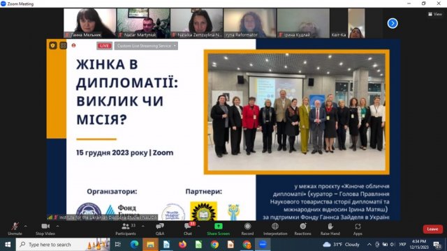 15 грудня 2023 року кандидат історичних наук, доцент, доцент кафедри міжнародних відносин Ганна Мельник взяла участь в онлайн-заході "Жінка в дипломатії: виклик чи місія?", який проходив у межах реалізації проєкту Наукового товариства історії дипломатії та міжнародних відносин "Жіноче обличчя дипломатії" (куратор - професор Ірина Матяш). Організаторами події стали Наукове товариство історії дипломатії та міжнародних відносин, Фонд ГаннсаЗайделя в Україні в партнерстві з Національним університетом "Острозька академія", Платформою "Подружжя українських дипломатів", Всеукраїнською громадською організацією "Територія Жінок".